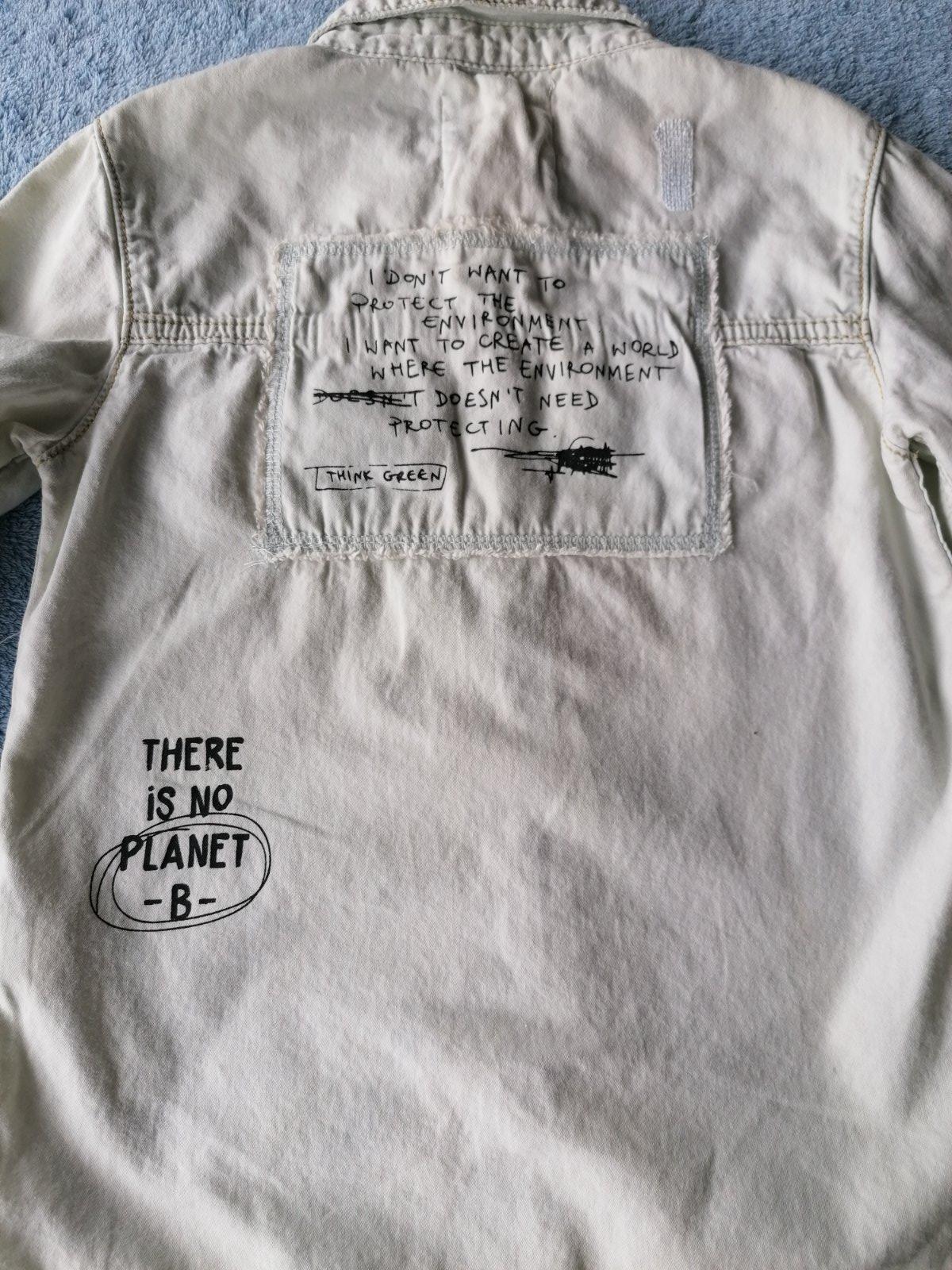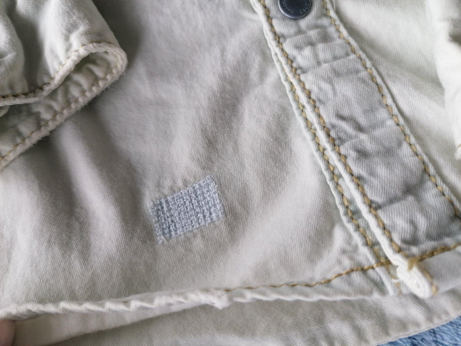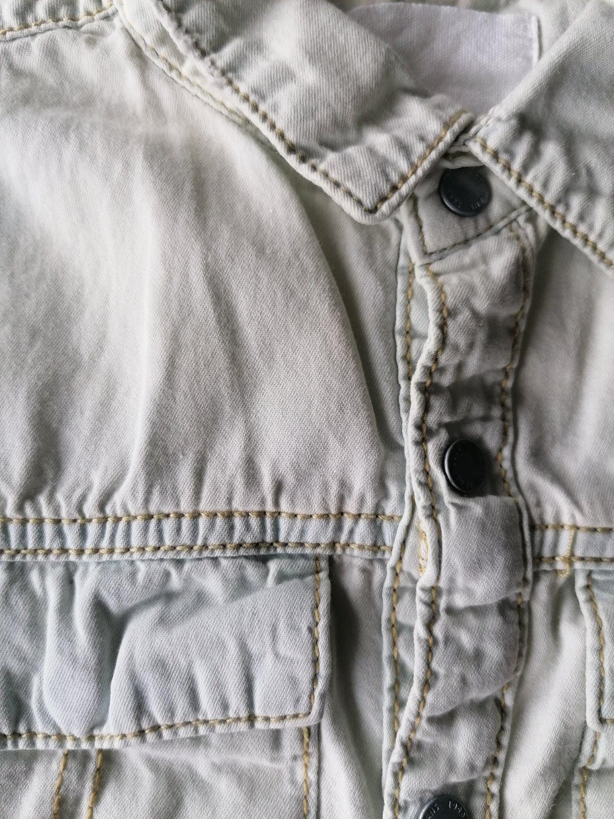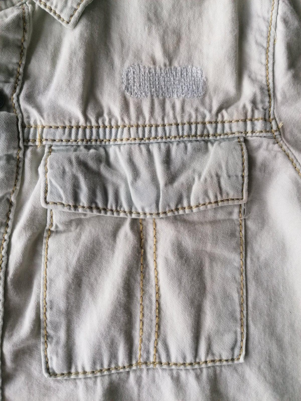 Ponúkam frajersku košeľu s roll on rukávmi. Vzadu napis, od nova vysuchane miesta, farba bledo modrá akoby vytiahnuta