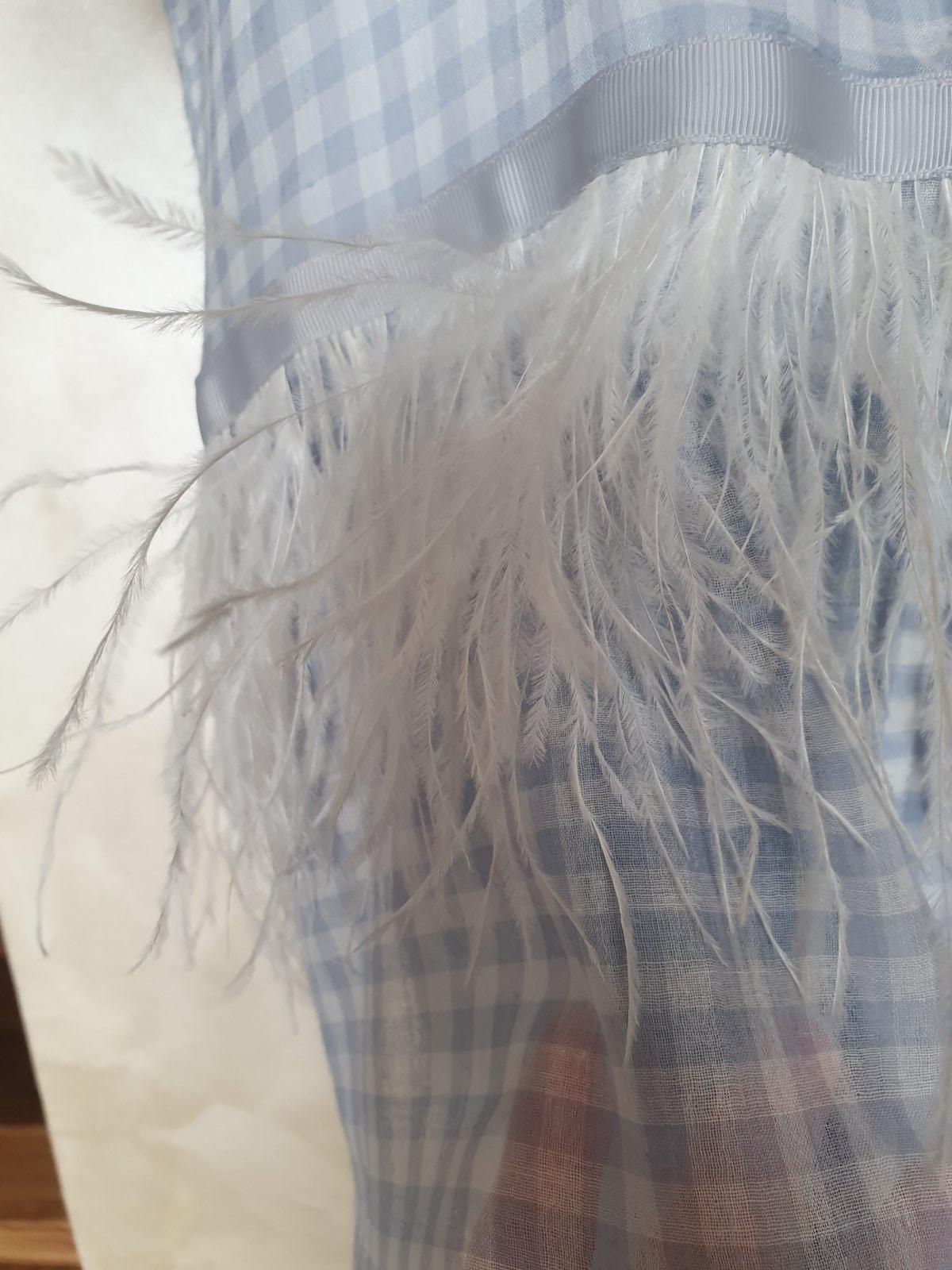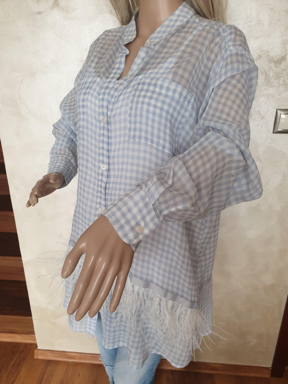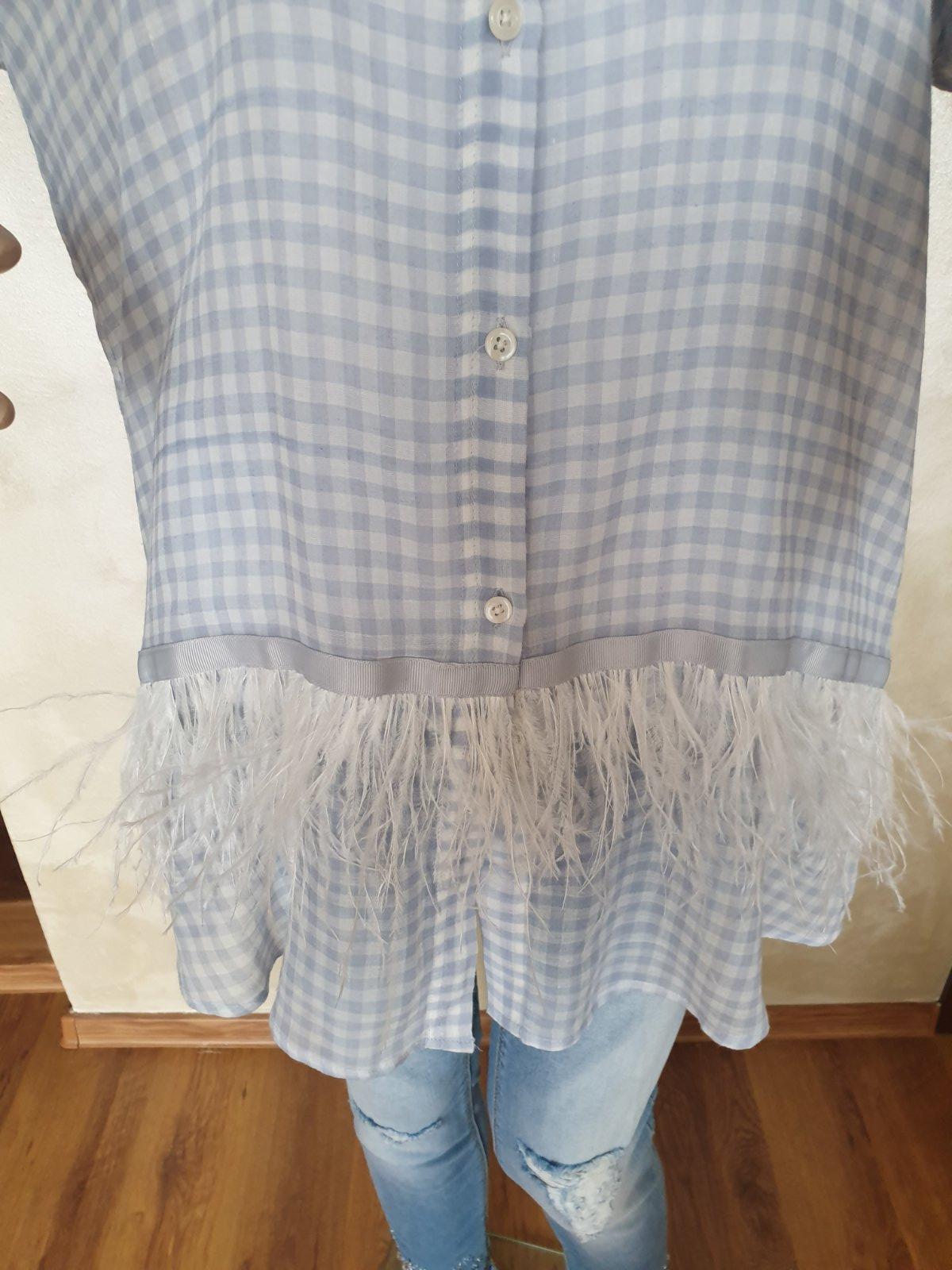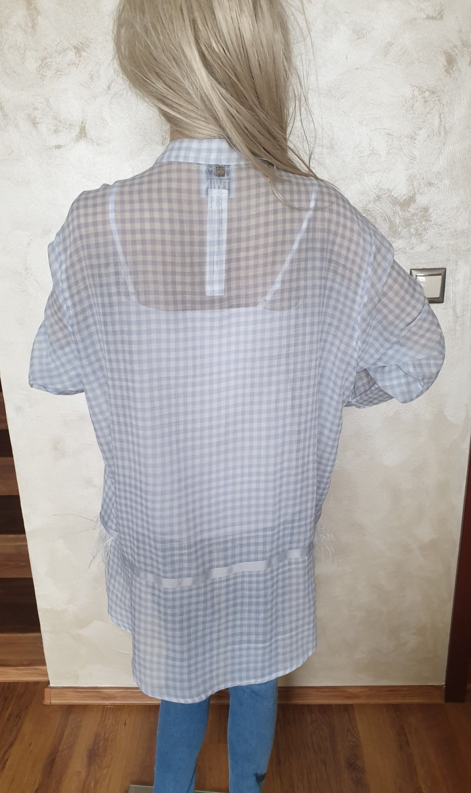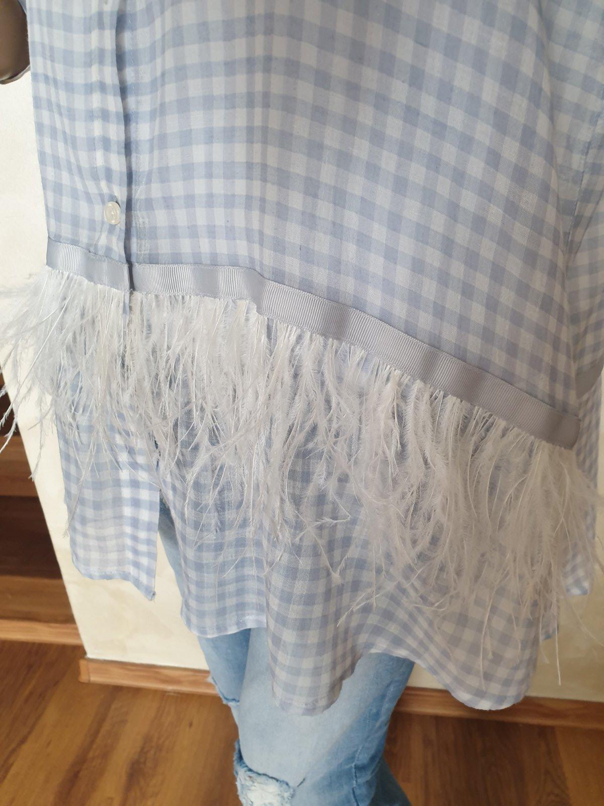 Nadherna lahucka kosielka s pierkami. Velkost je velkost L, ale je to oversize strih, tak ak ma niekto rad volne veci tak ukaze pekne aj na mensom cisle. Velmi napadita, kazdeho zaujala. Co sa tyka prania, tak staci preprat v rukach a po vyschnuti pierka nasuchorit. Nová s visackou.