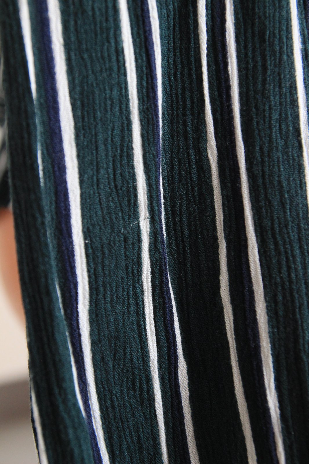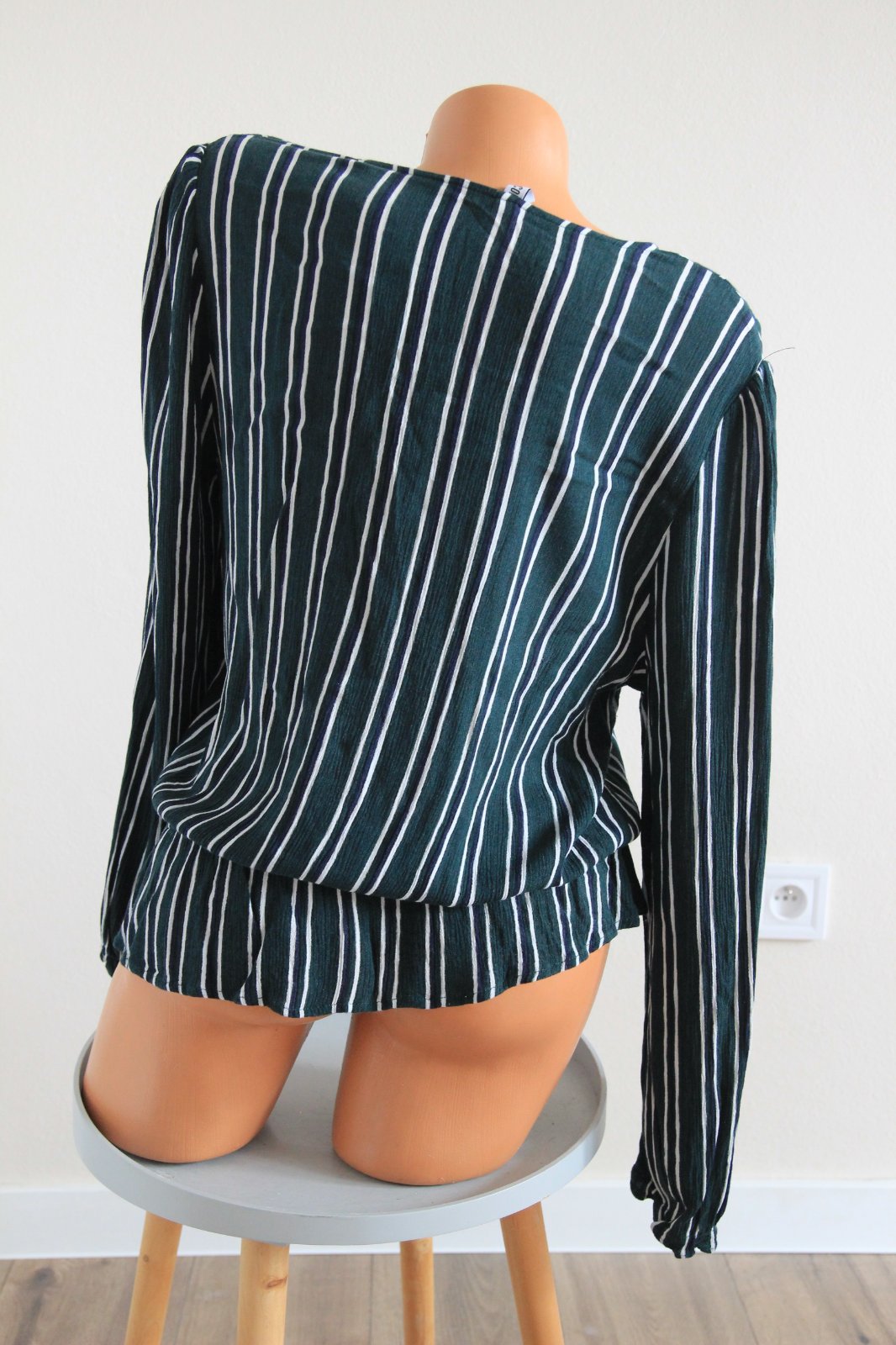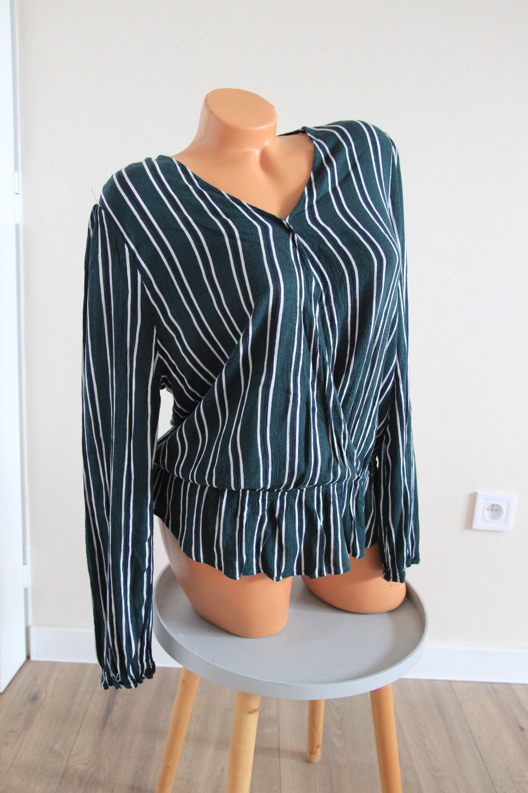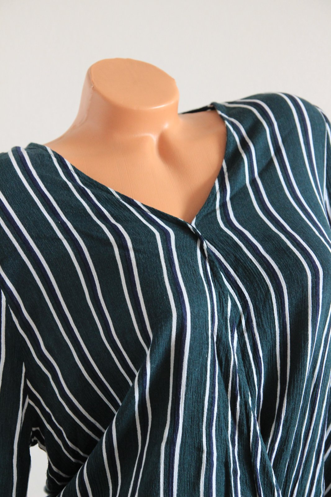 Tmavo zelená pásikavá blúzka, veľkosť L, na rukáve su dve menšie zatiahnutia. Materiál je 100%viskóza.