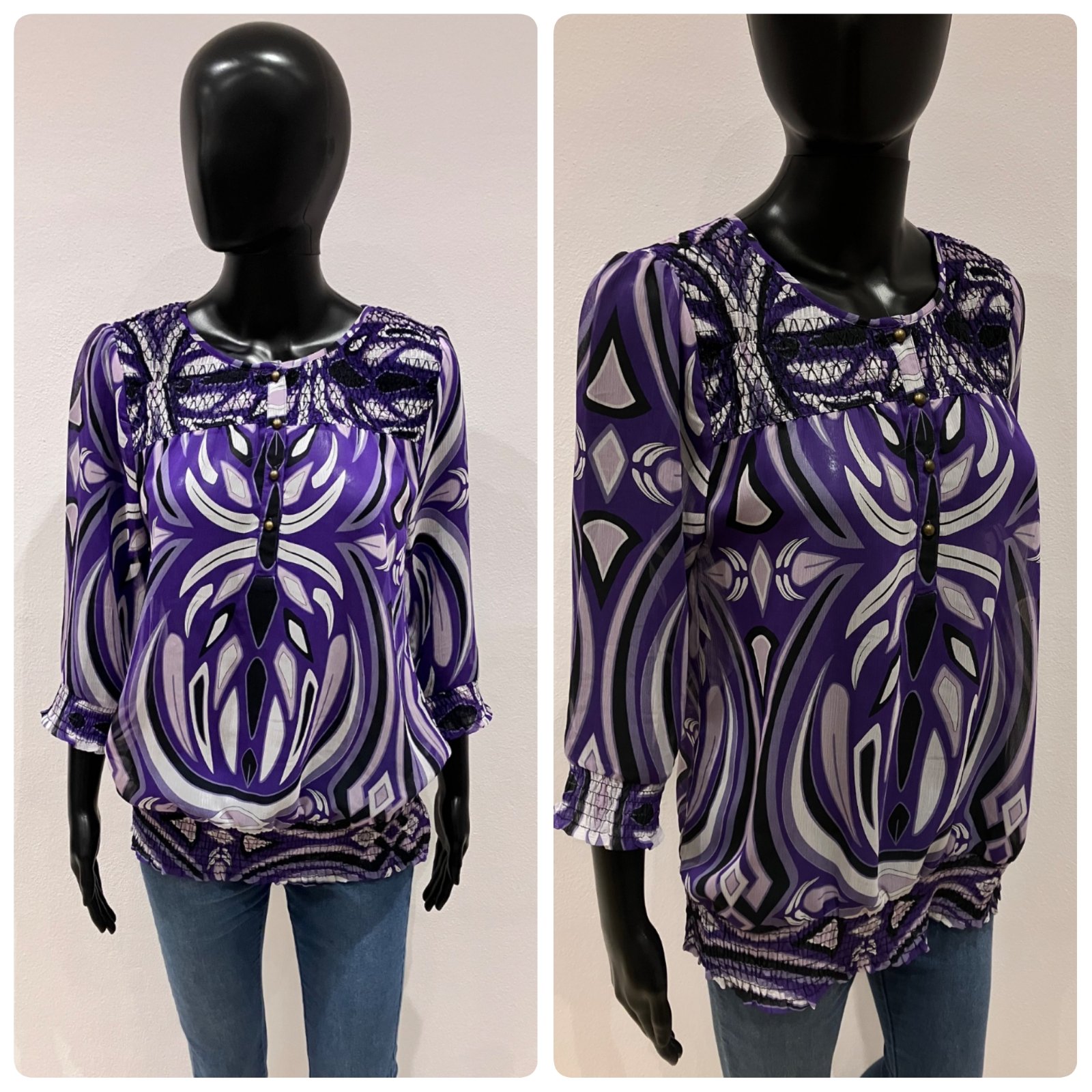 Dámska, dievčenská blúzka s trojštvrťovým rukávom, priesvitná, tenká, na koncoch stiahnuté gumou v páse a na rukáve, nie je elastická, farba fialovo-bielo-čierna.