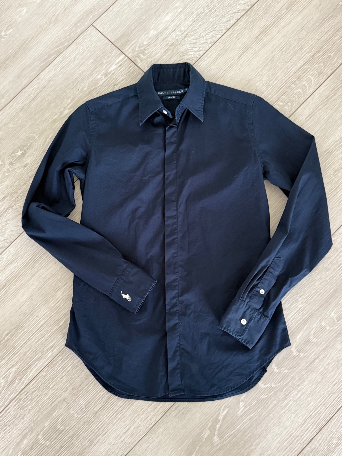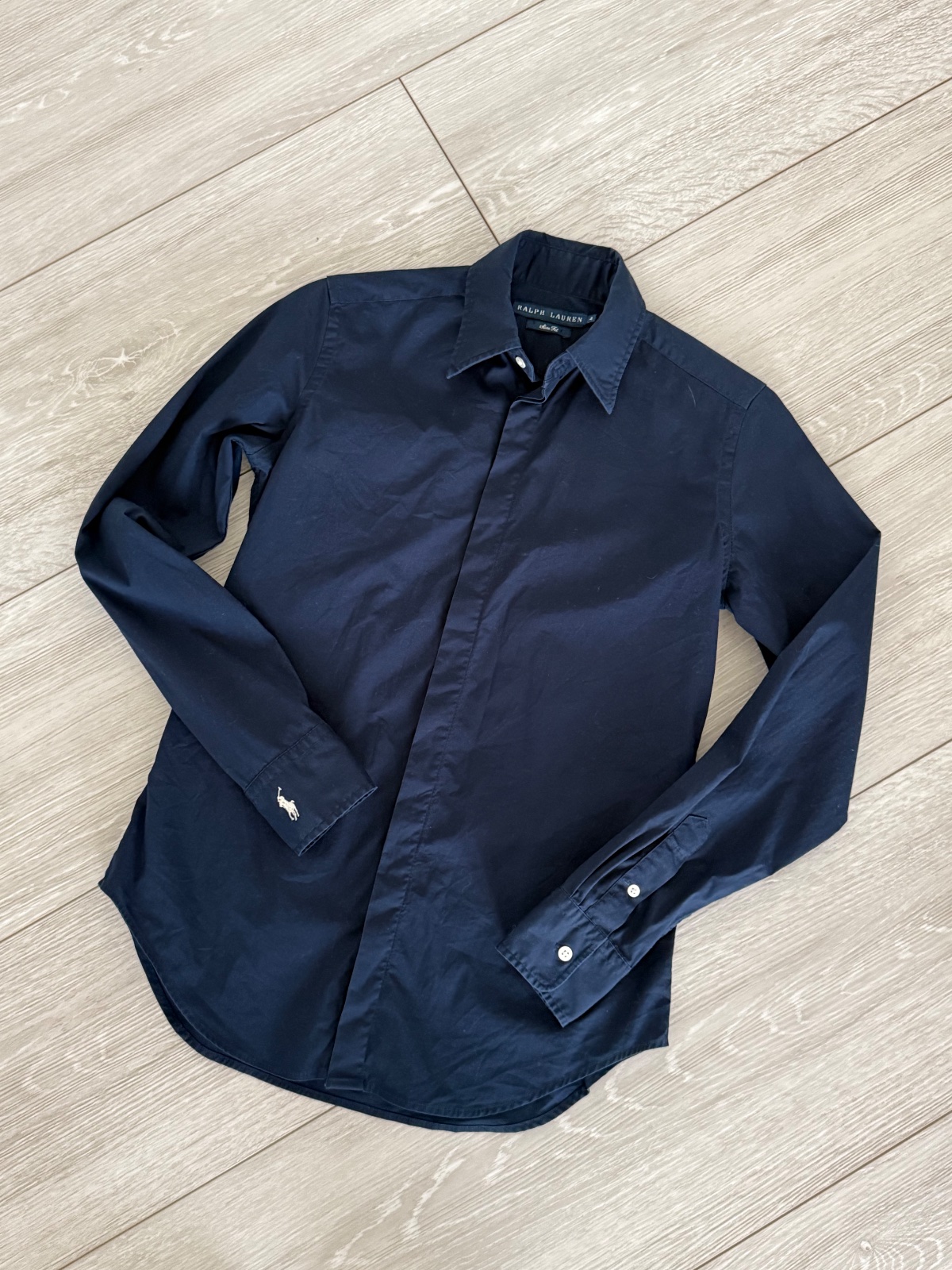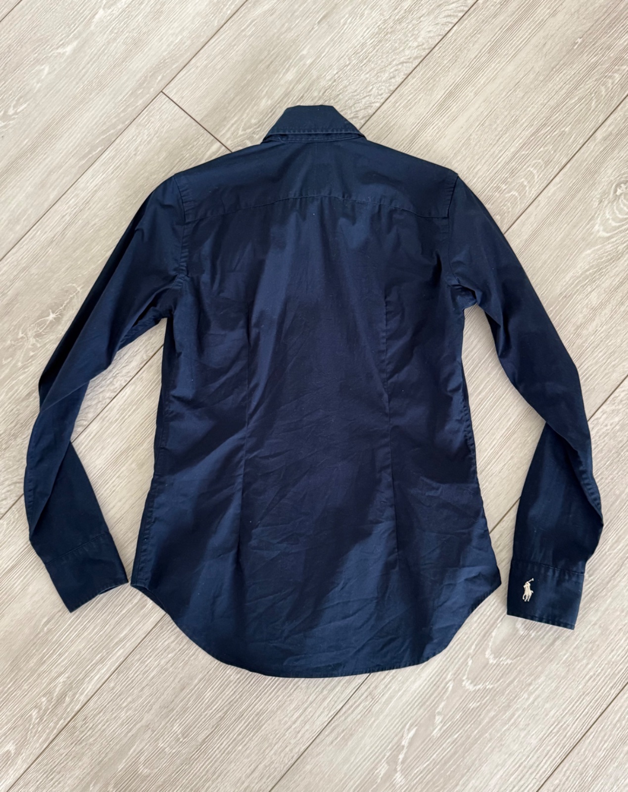 Úžasná tmavomodra pánska košeľa Ralph Lauren. Slim fit strih, sedí perfektne. Biele logo vyšité na pravom rukáve, skryté gombíky. Velkosť 4, sedí S-M. Nosená, bez poškodenia. Miery: šírka prsia-47, dĺžka stredom cez chrbát 64 cm.