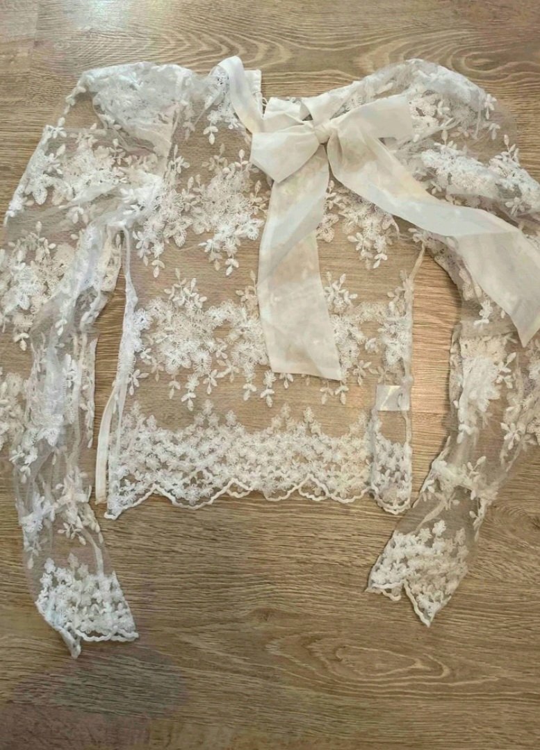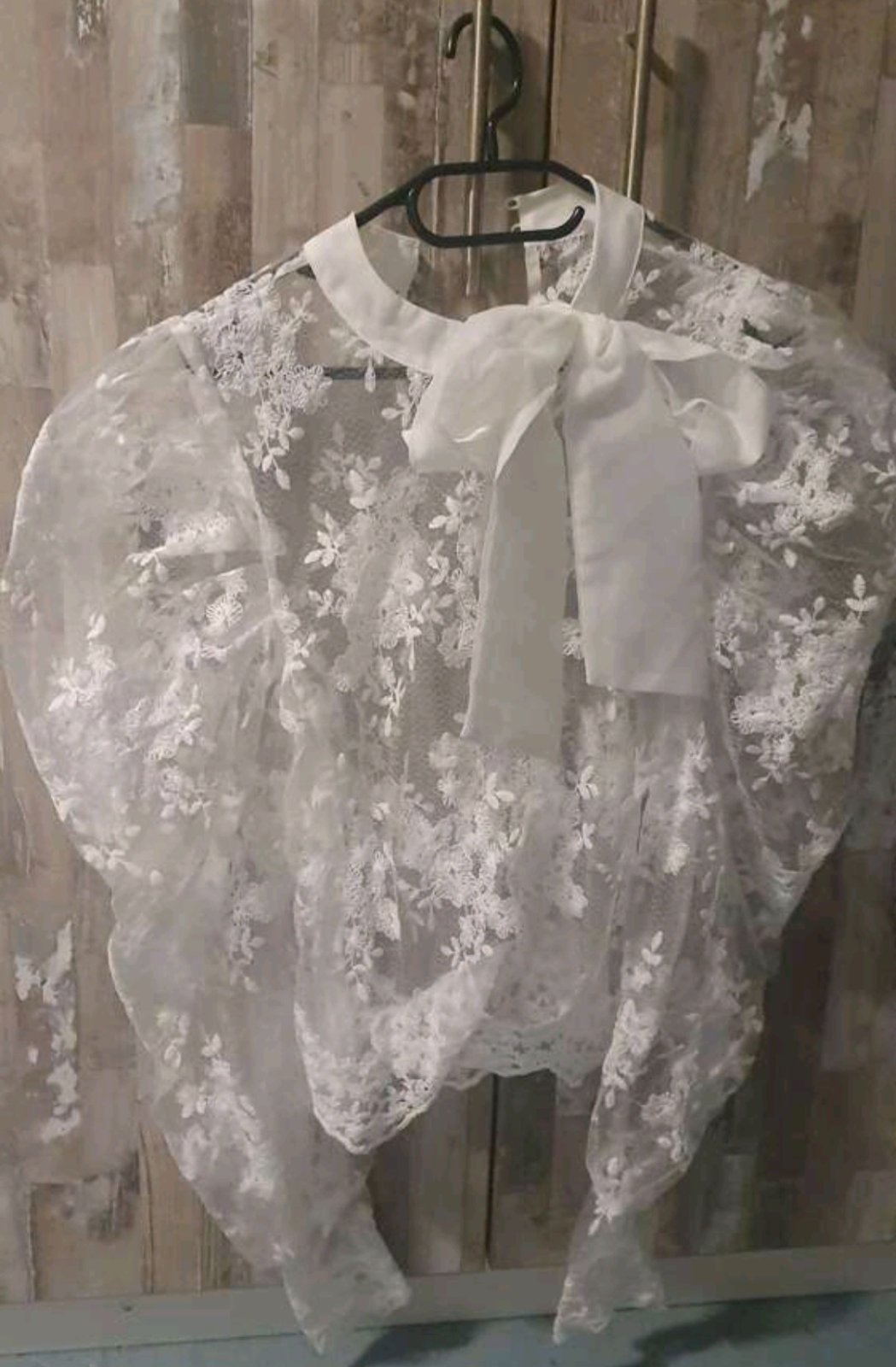Predám novú štýlovú ľahkú dámsku blúzku, s vysačkou. Vzadu zapínanie na 1 gombík, s krajkovýni doplnkami vpredu aj na rukávoch. Vhodná na veľkosť XS-S .