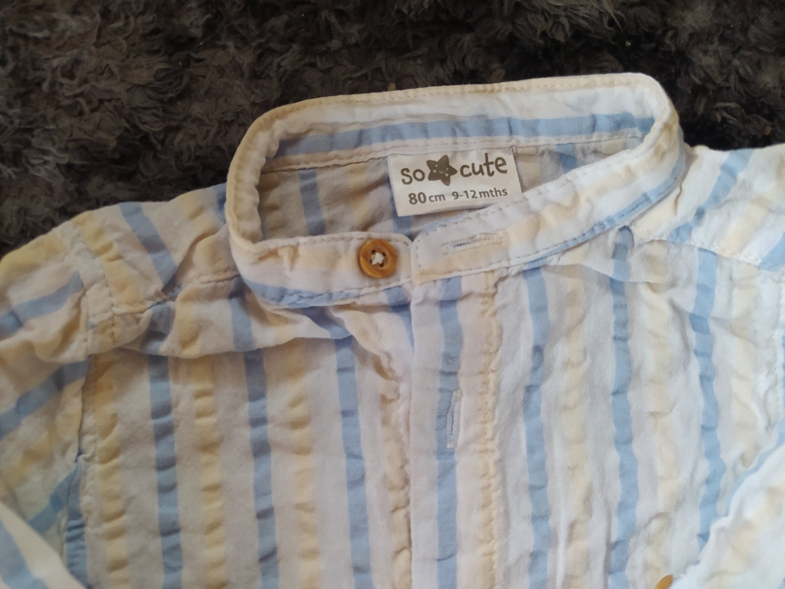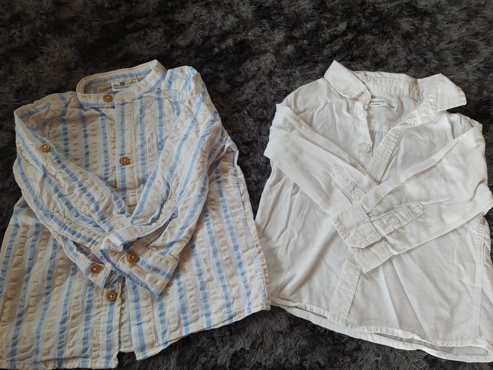 Nosena košeľa po jednom dieťati. Má malý, skoro neviditeľný fľak na prednom vrecku. Ináč bez poškodení, ešte poslúži. Cena 2€ vrátane obyčajného poštovného