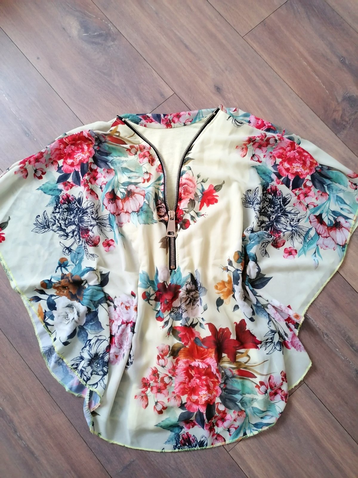 Tunika voľného strihu, po bokoch sú obsite otvory na opasok(na foto) , určite odporúčam nosiť s opaskom, krásne potom stiahne v páse, vyformuje postavu. Tunika je podsita v strednej časti ešte nepriehľadnou látkou. Veľkosť nie je udaná, ja som nosila ako M, sadne aj na menšie aj väčšie keďže strih je voľný a opaskom si to stiahnete podľa potreby. Dĺžka 69 cm, šírka medzi tými otvormi na opasok 45 cm.