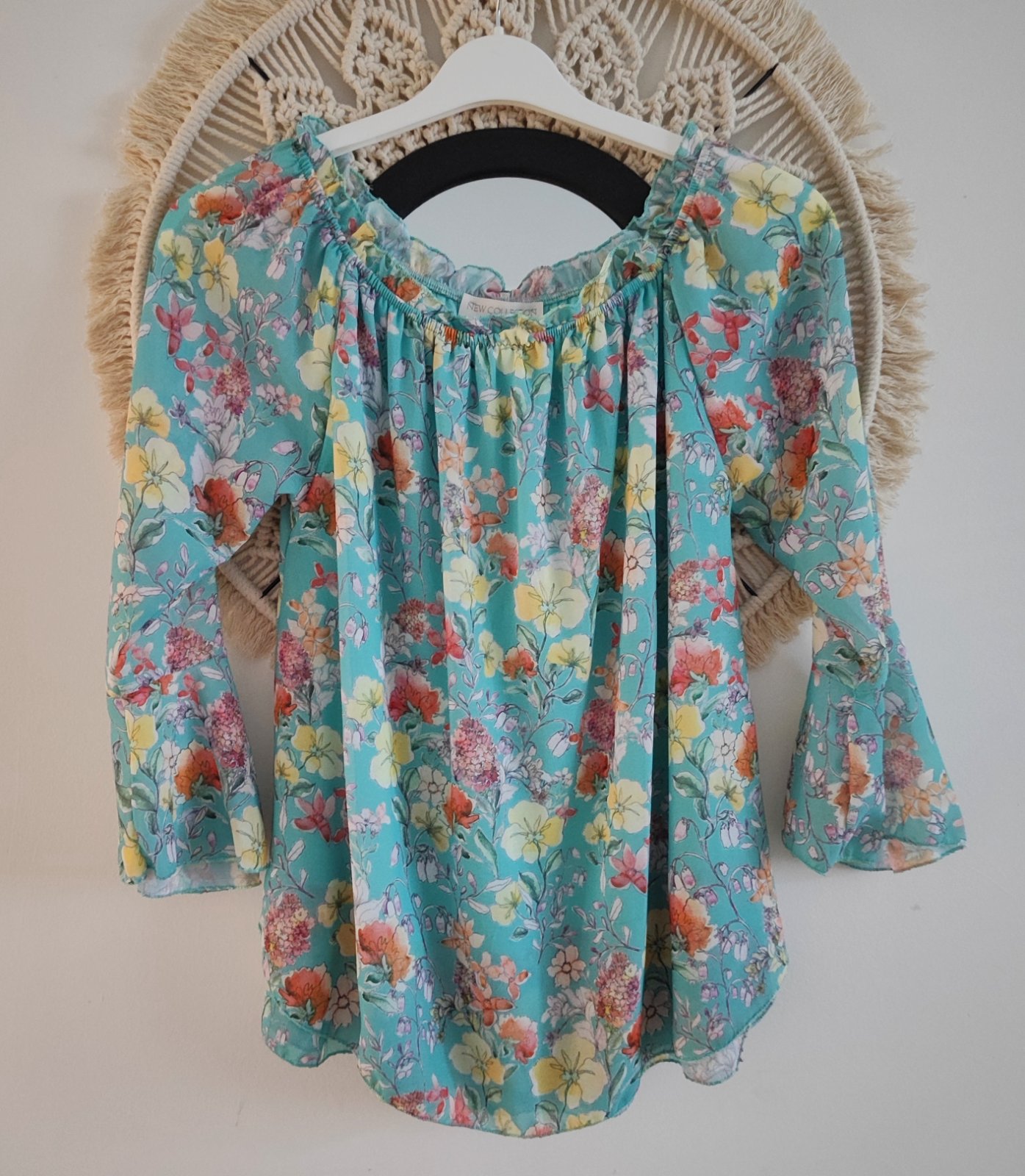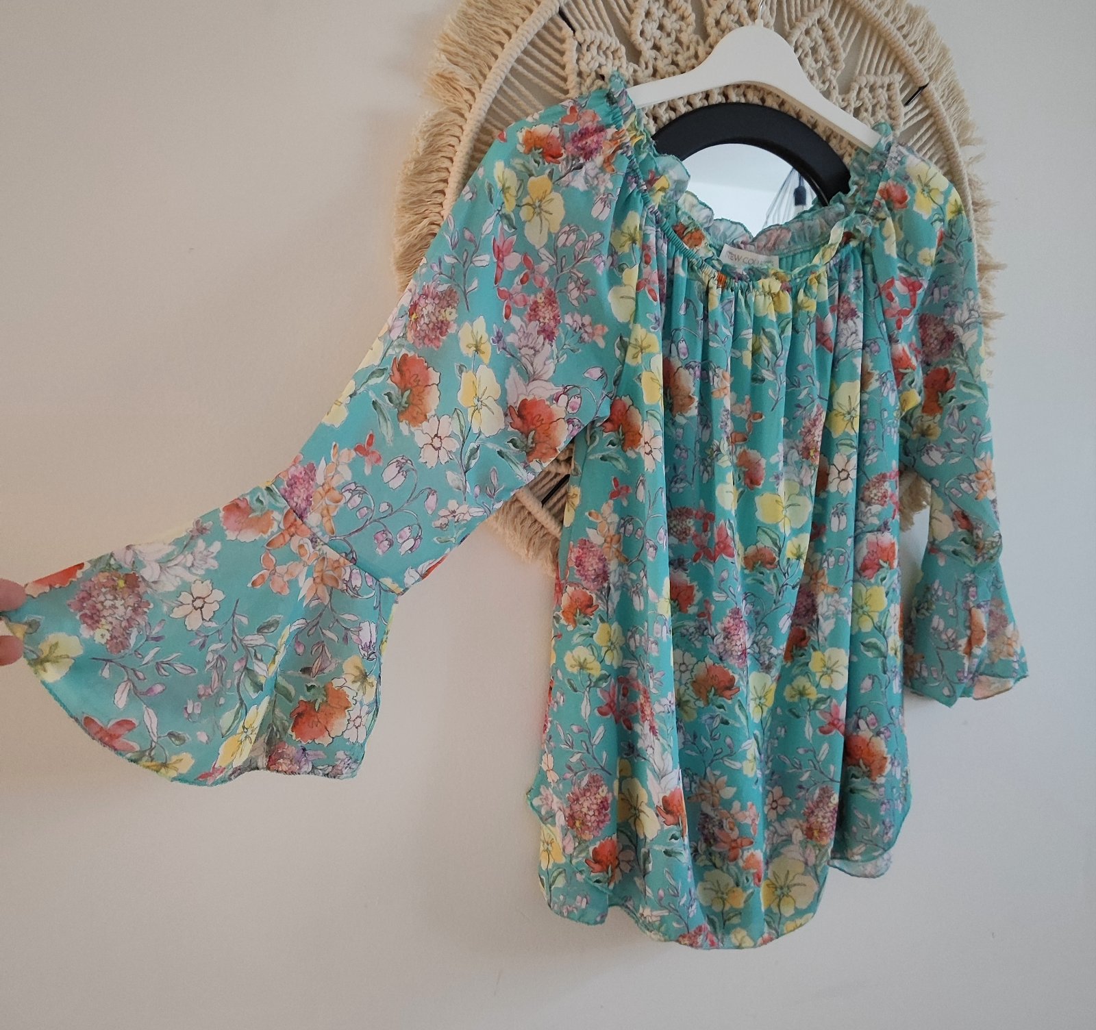 Svetlomodrá farba, veľkosť M. Dĺžka 74cm, šírka 42cm, dĺžka rukávov 41cm(merané od pliec). Rukávy sa dajú ešte vďaka gombičiek skrátiť. Blúzka je mierne oversize, oblečená iba raz, je ako nová.