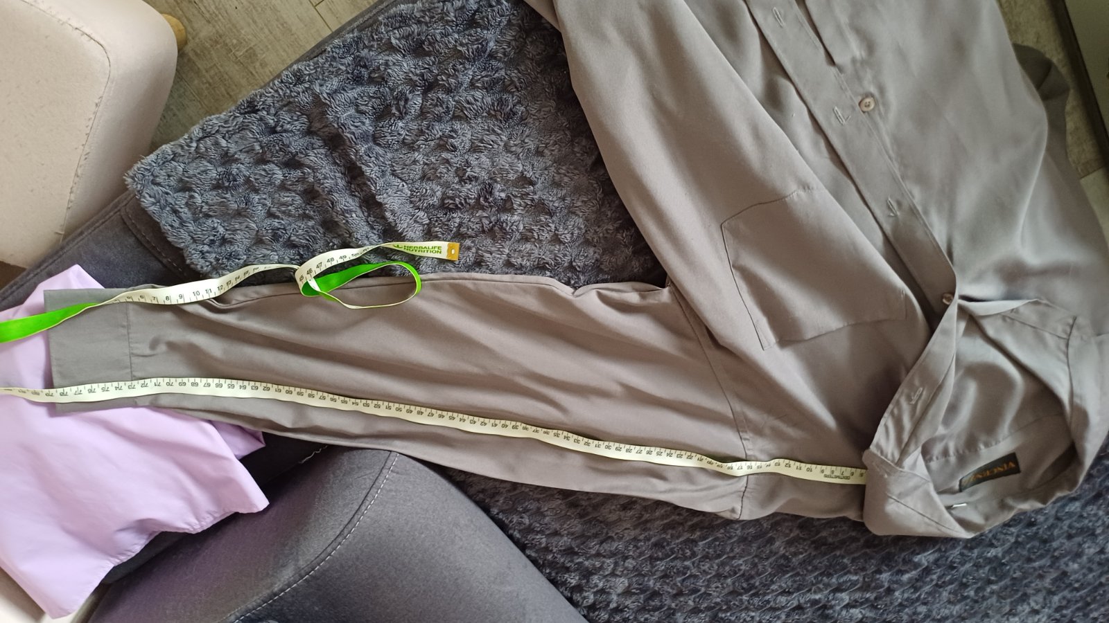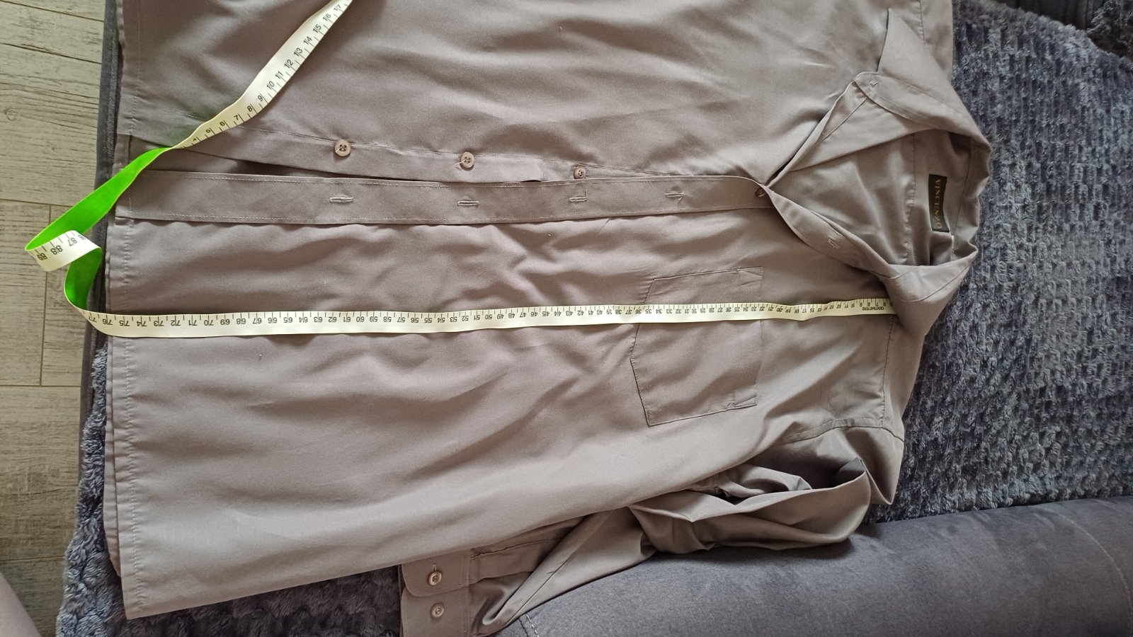 Sivá košela - dlhý rukáv, dĺžka je 76cm a rukáv od krku je 79cm. Cena 3 eura
