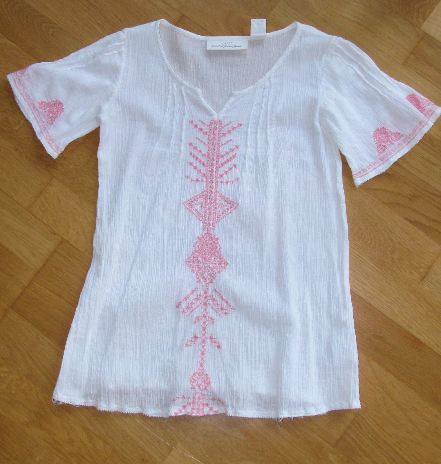 par krat oblecena, krasna padava bluzka alebo skor tunika. Dlzka od pleca cca 62,5 cm, sirka pod pazuchami 42 cm, ale ako je material plisovany, este sa do sirky natiahne.