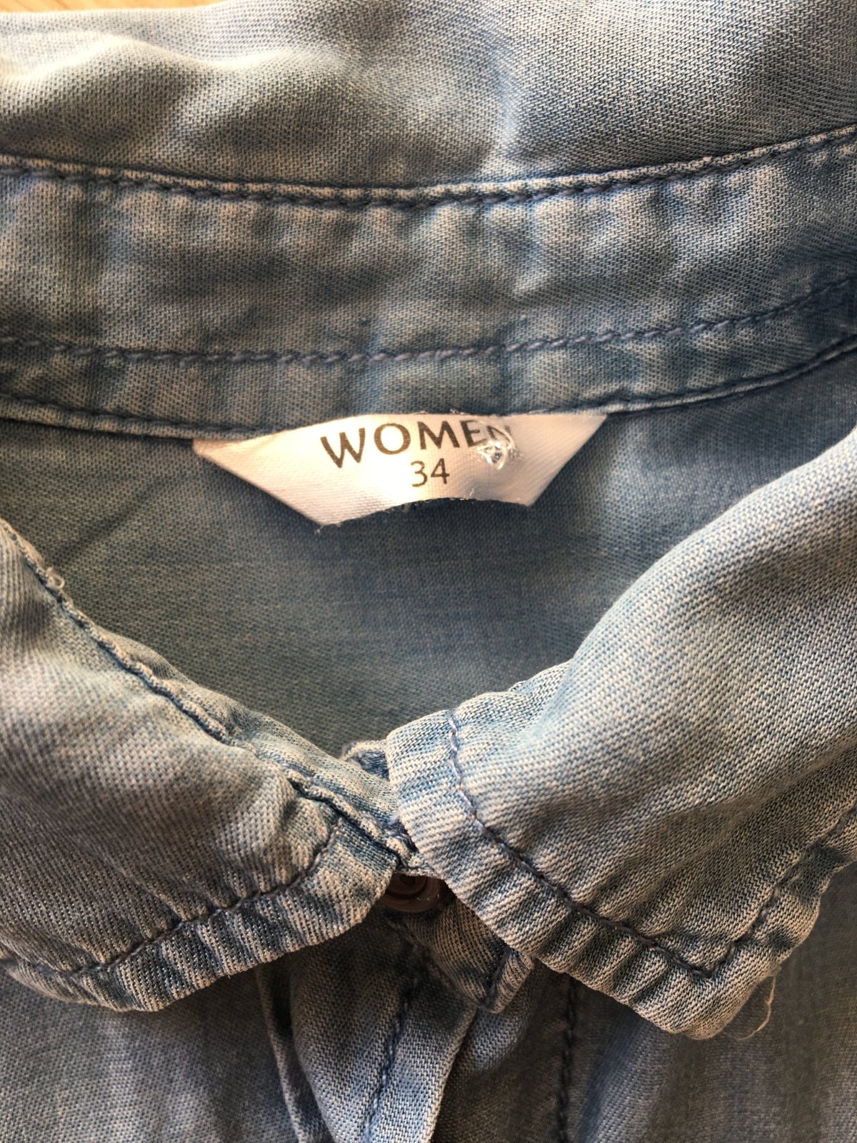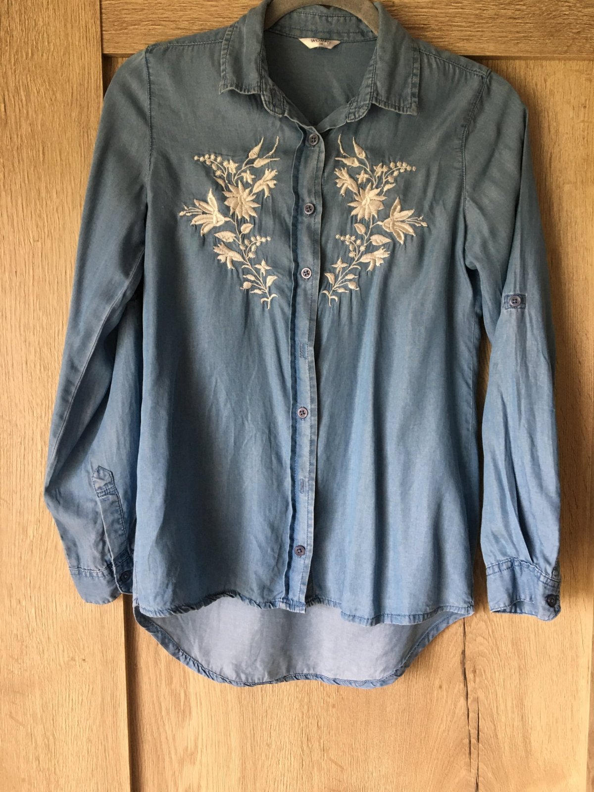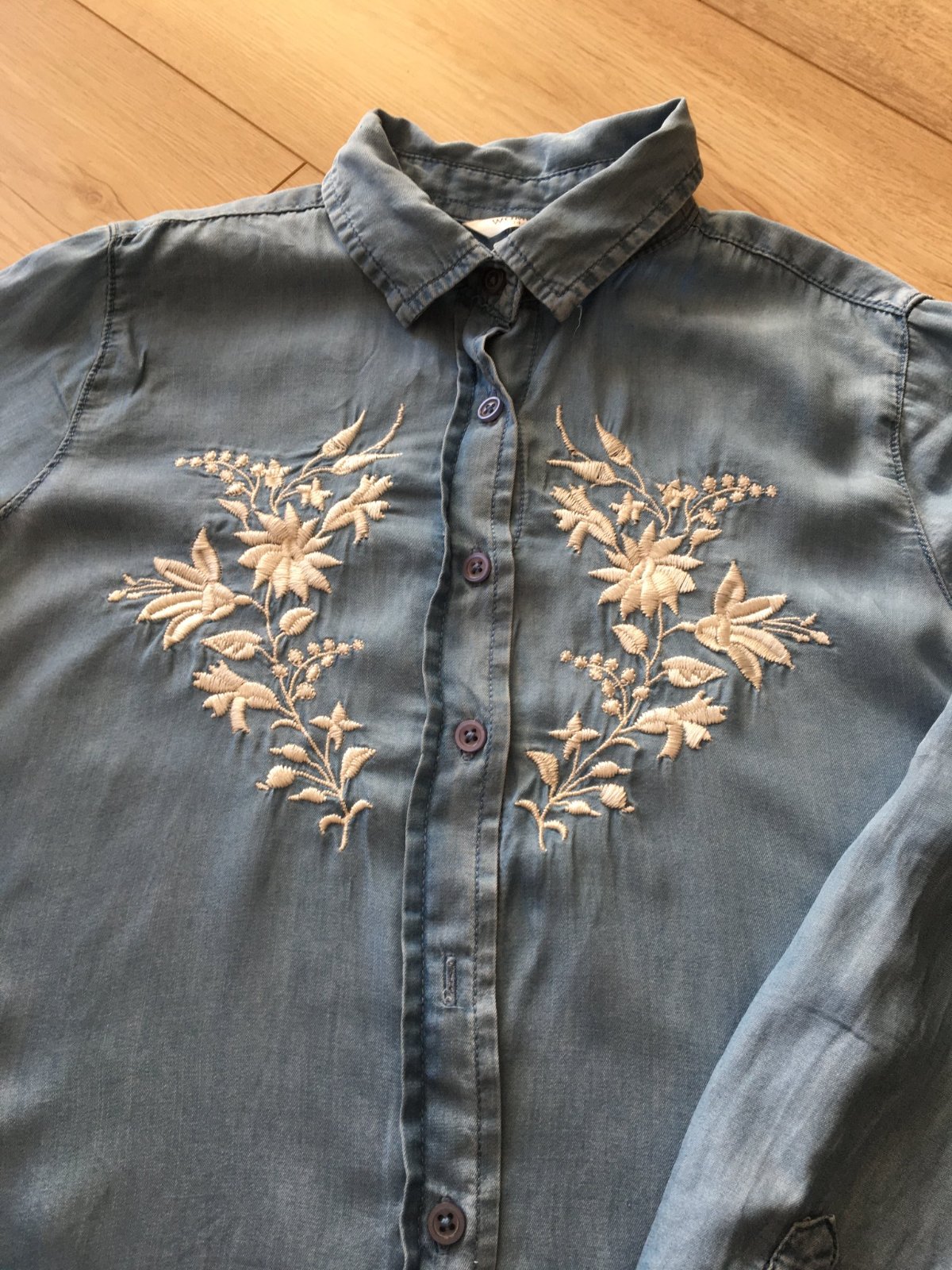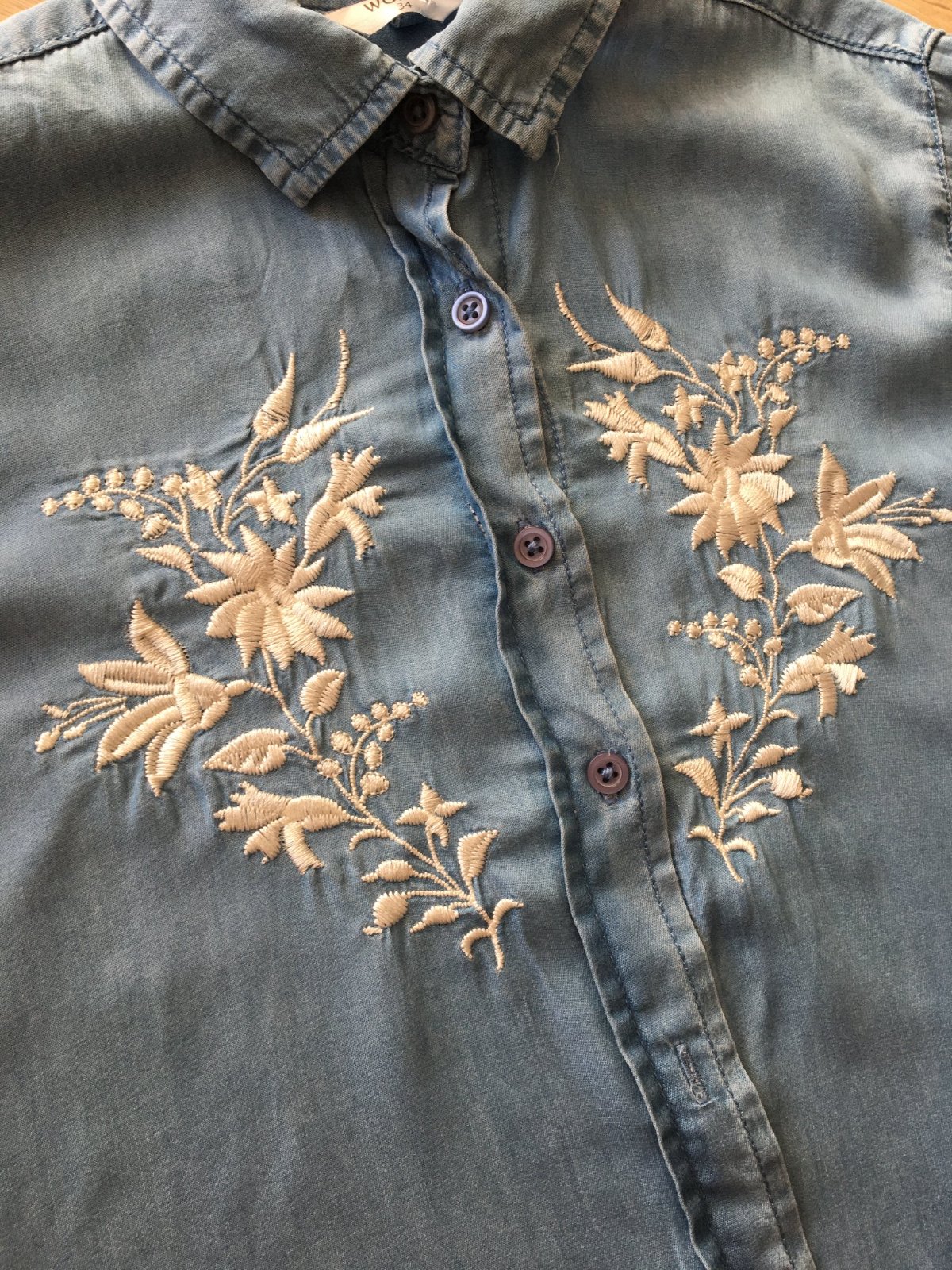Dámska riflová košeľa s kvetinovou výšivkou. Veľmi pekný stav.