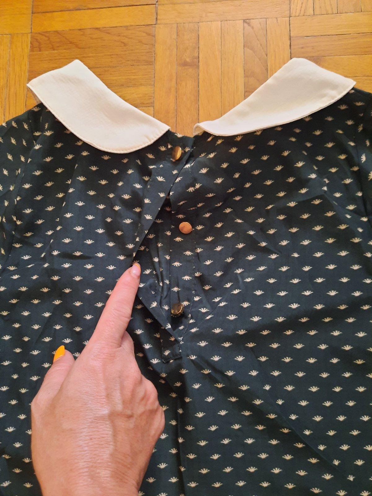 Krásna ľahká blúzka s jemným vzorom v top stave. Zaujímavý golier-3 vrstvy nad sebou. Vzadu sa zapína na gombík.