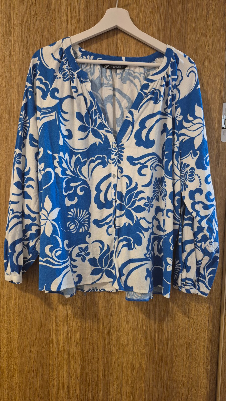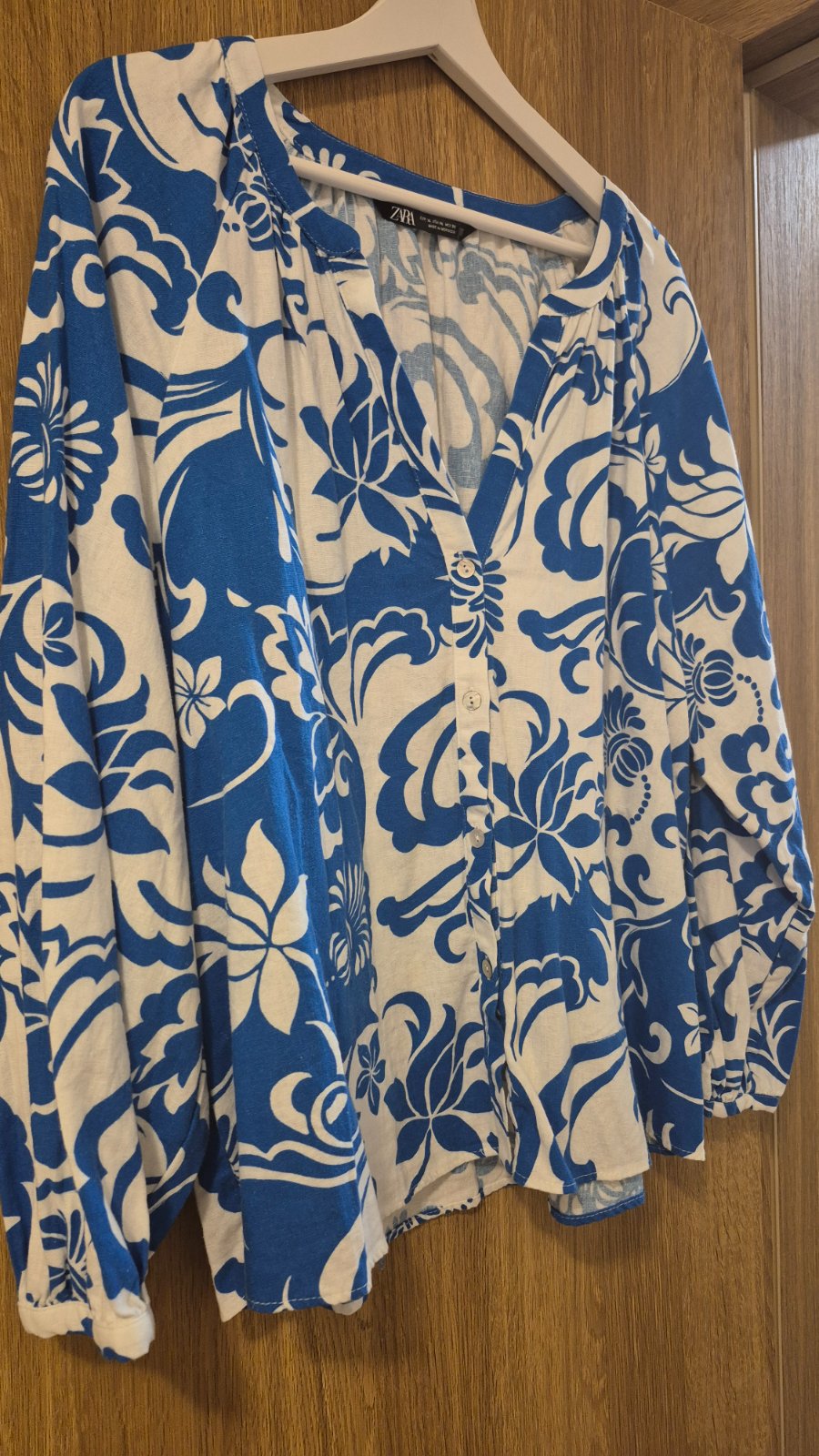 Predam peknu lanovu bluzku znacky Zara,velkost xl,ma peknu farebnu kombinaciu,pekne sedi na postave,dlzka 65cm sirka 122cm rukav 67cm,povodna cena 39,95 nova 18,5 vratane postovneho a balneho,platba vopred na ucet