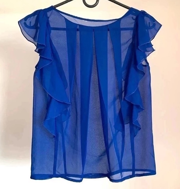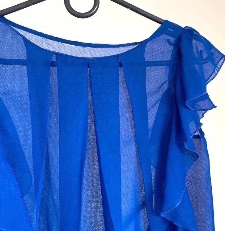 Talianska móda, krásna modrá farba, vpredu na hrudi robí volán akoby vodu, pekne ukáže na postave, môžete nosiť ku legínam alebo ako mini šaty, kombinácia s krajkou na chrbáte a rukávoch, 100% stav