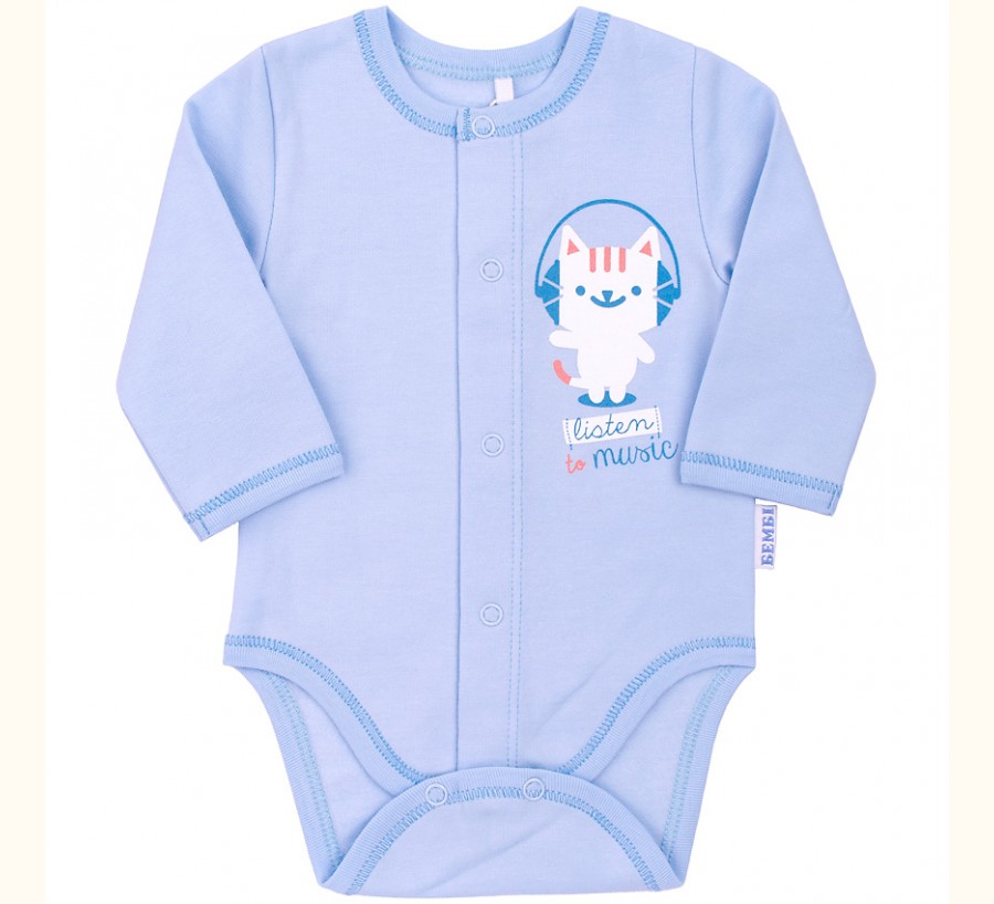 Kojenecké body obľúbenej značky BEMBI v bledomodrej farbe s veselou aplikáciou ,so zapínaním na patentky po celej dlžke.