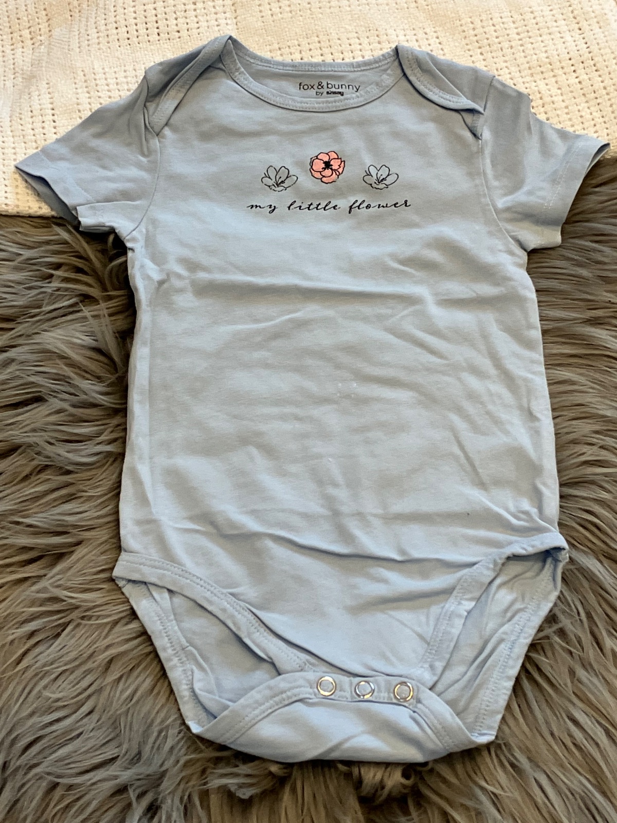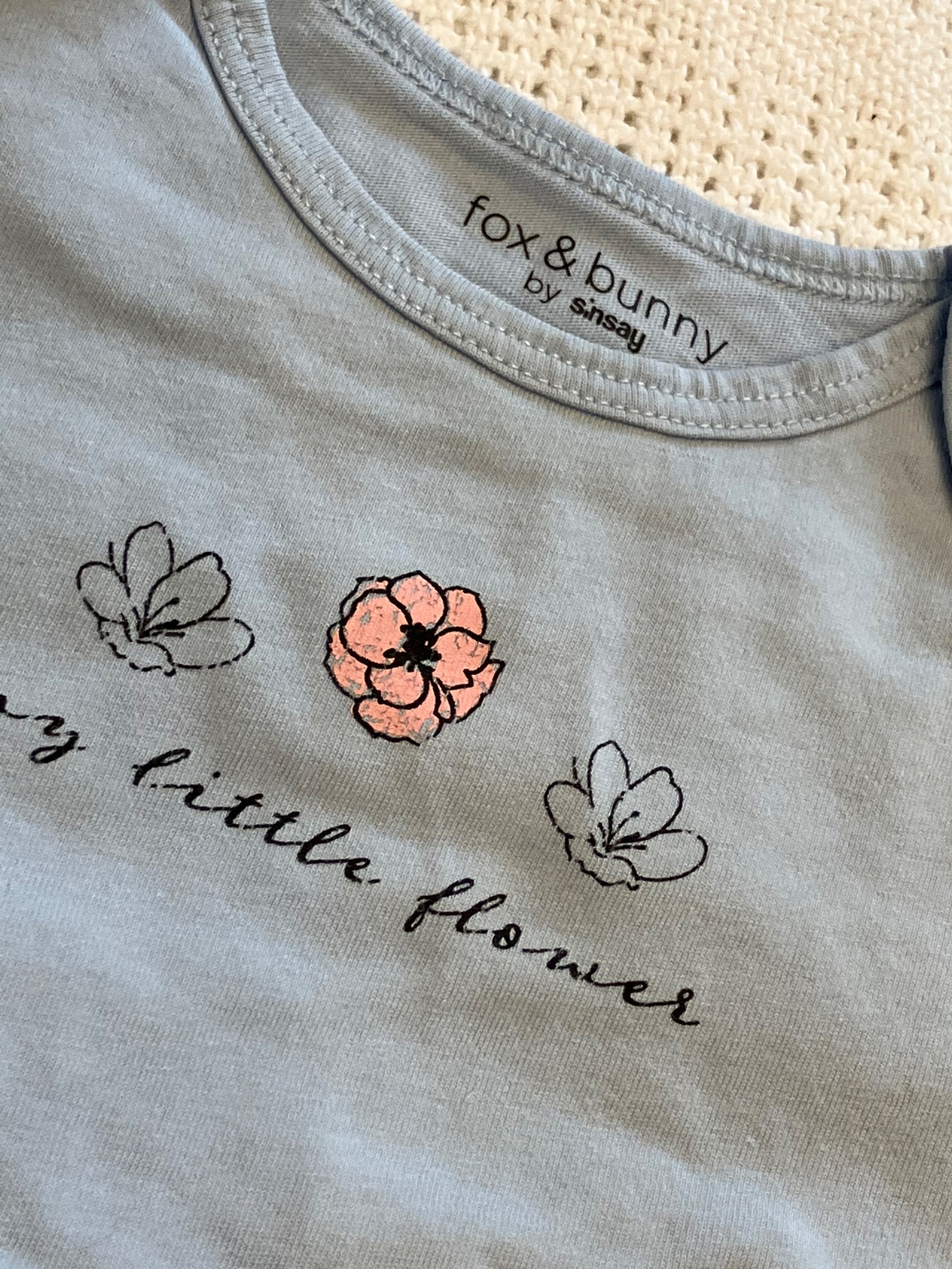 Dievčenské body s krátkym rukávom, kvetmi a nápismom, elastické, zapínanie na spodku na cvoky, farba svetlomodro ružovo čierna. Materiál 100%bavlna.