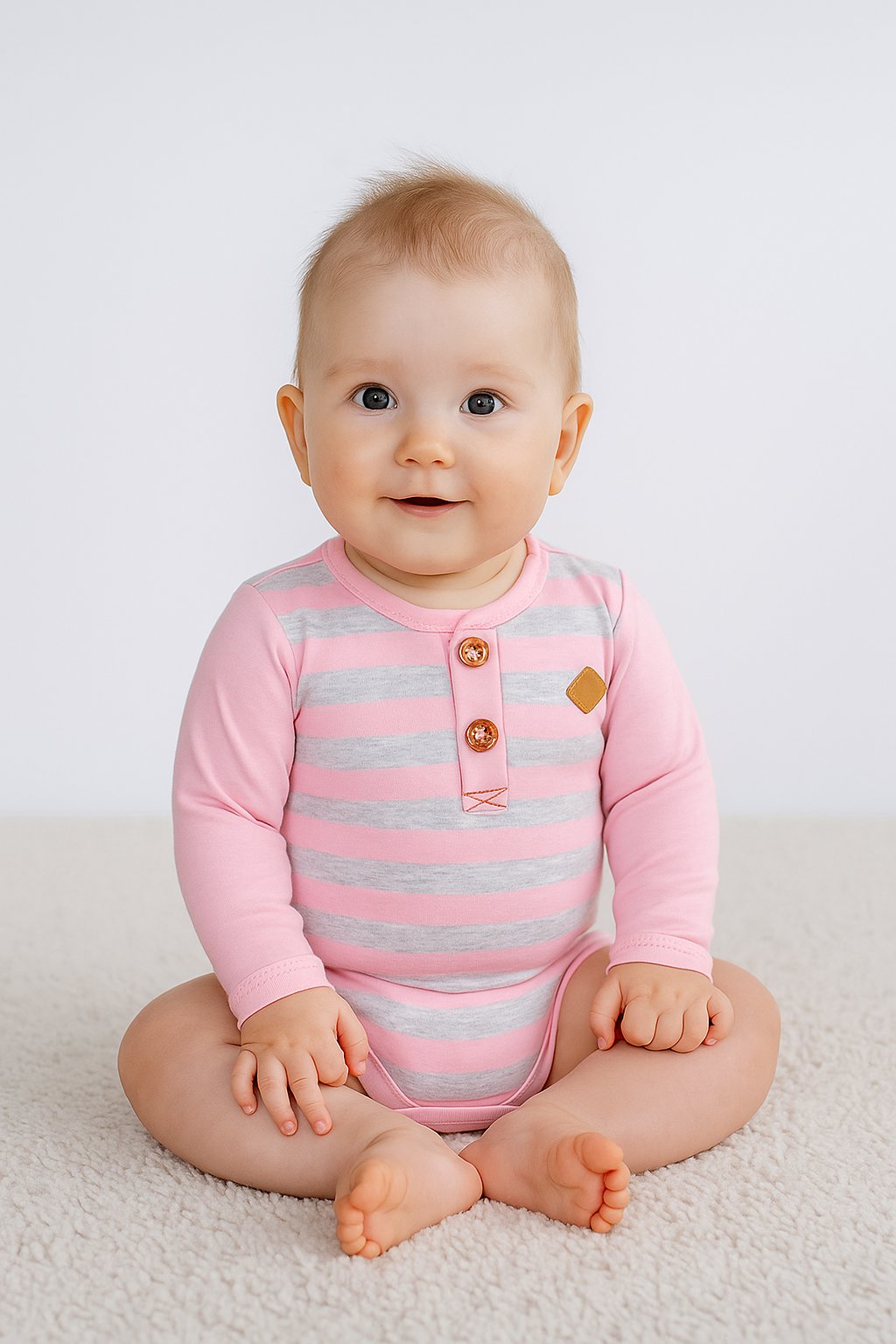 Roztomilé detské body s dlhým rukávom v kombinácii ružovej a sivej farby je ideálnou voľbou na každodenné nosenie. Jemné pruhy v strede dopĺňajú hladké jednofarebné rukávy, ktoré poskytujú maximálne pohodlie a voľnosť pohybu. Ozdobné gombíky na hrudníku a malý štýlový detail z eko kože robia z body nielen praktický, ale aj moderný kúsok.