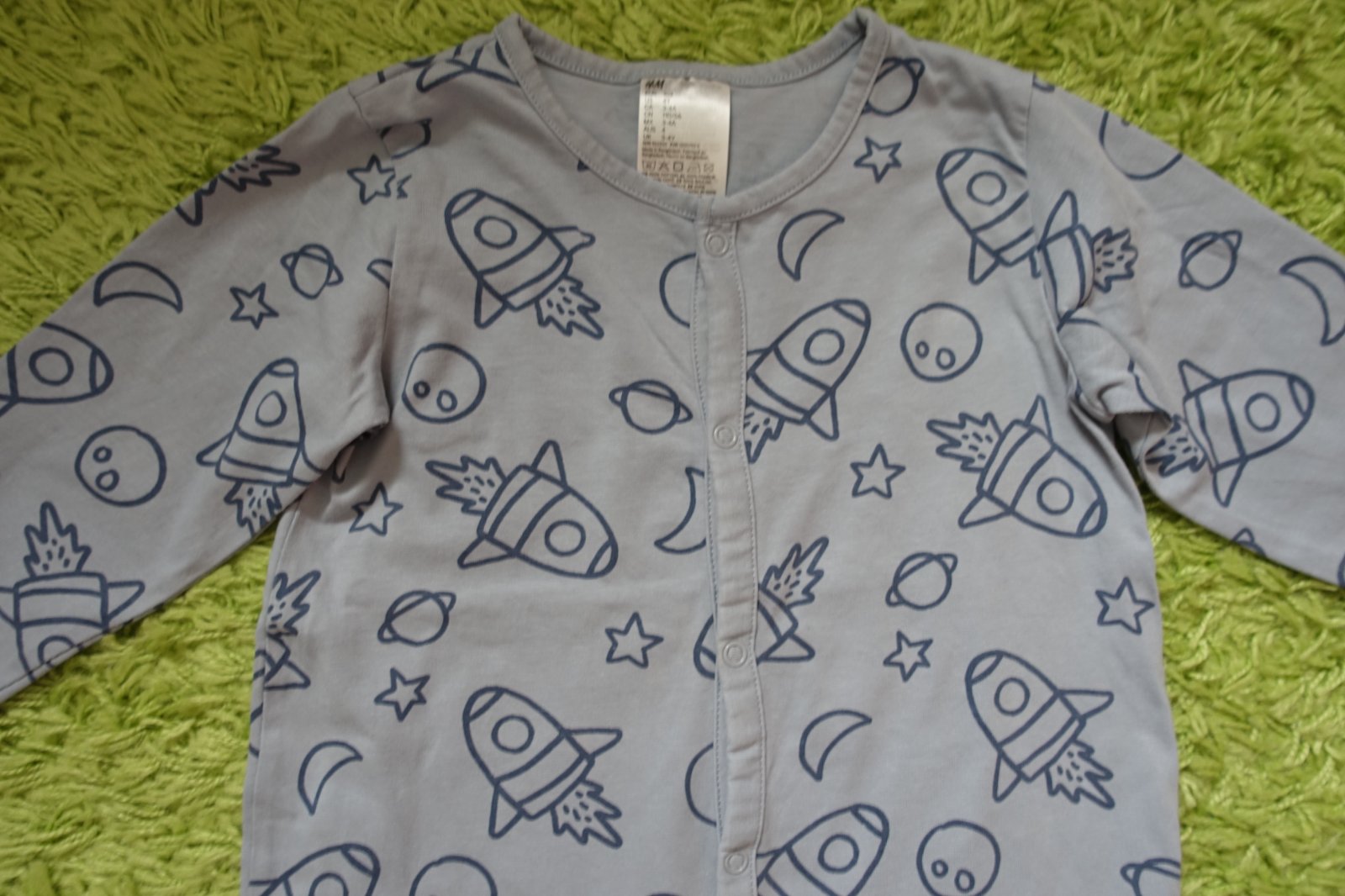Predám nosené bavlnené pyžamko s raketami. Bolo nosené na striedačku aj s inými, je vhodné už len pre nenáročnú mamičku, trolinka pri naklonení sa mi zdá, že sa chce robiť chĺpoček z prania, ale ešte nie je žmolkavé. Nie je fľakavé, ani deravé. Na spinkanie ešte poslúži. Celková dĺžka od pliecka po spodok nohy je 87 cm a od pliecka po rozkrok je 51 cm. (V10)