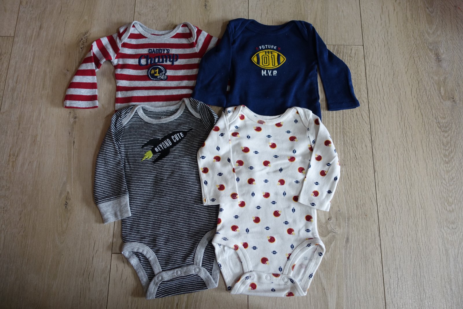 Predám bavlnené body všetky vo veľkosti 3M (sedí na našu 56). Mali sme ich iba pár krát oblečené, mali sme toho veľmi veľa, nestíhali sme všetko nosiť. Modré sme mali 1x, to sme nestihli využiť. Žiaľ na bielom s prilbičkami som našla 3 maličké fliačiky. Dva z boku bodičiek a jeden na rukáviku. Sú úplne slabulinké, vidno ich len pri naklonení a bližšom zapozeraní sa. Inak sú úplne do stratena. Doslova ich musíte hľadať v tom vzore. Možno ešte pôjdu oprať. Inak pekný stav. Nemajú ani žmolky, ani diery. Celková dĺžka bieleho a šedého pásikavého body od pliecka po spodok pri zapnutí je 37 cm, modré 35,5 cm, bordové pásikavé 36 cm. Predávam iba spolu. (B)