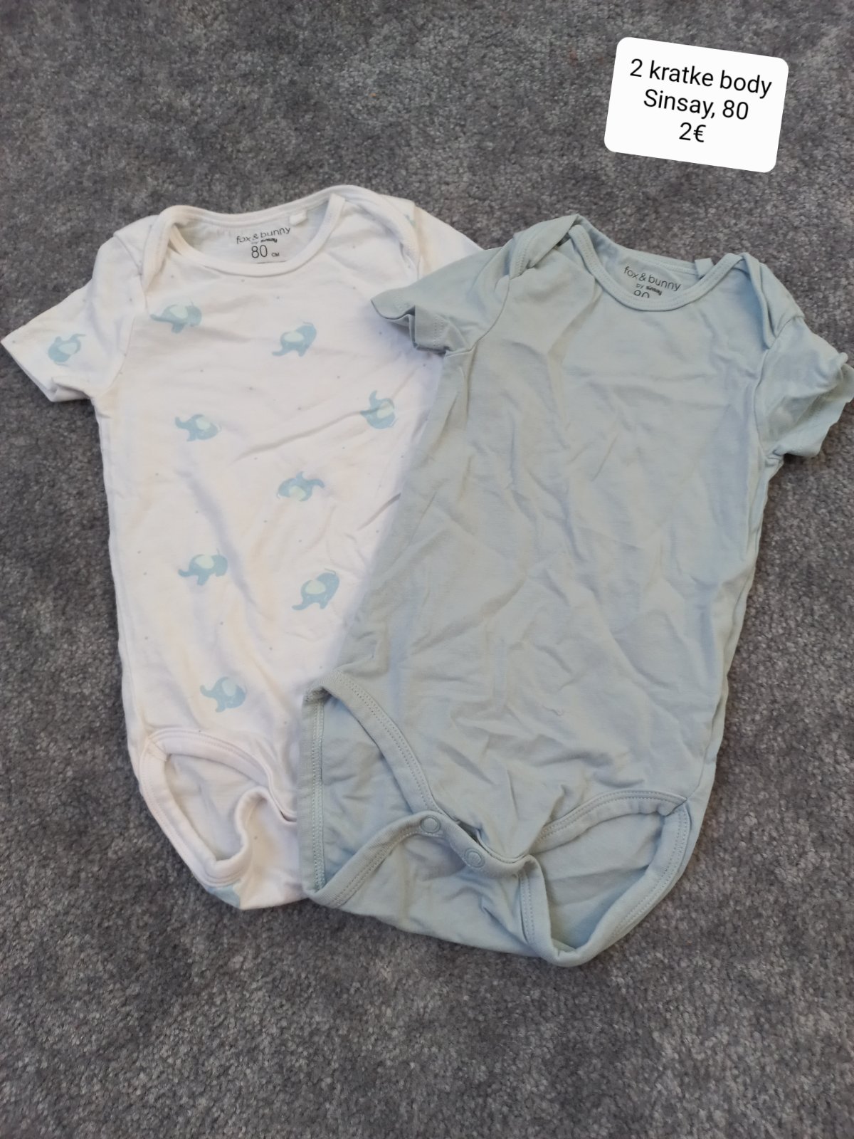 Súpravy nohavice rôzne veľkosti,ale nosili sme spolu...nositeľné od 80-86 ak nemáte plienku aj 92...je to značka F&F a tričká dopodopo tiež nositeľné 80-86... nohavice 3,50€ks a tričká 2€ ks.. Cena...
