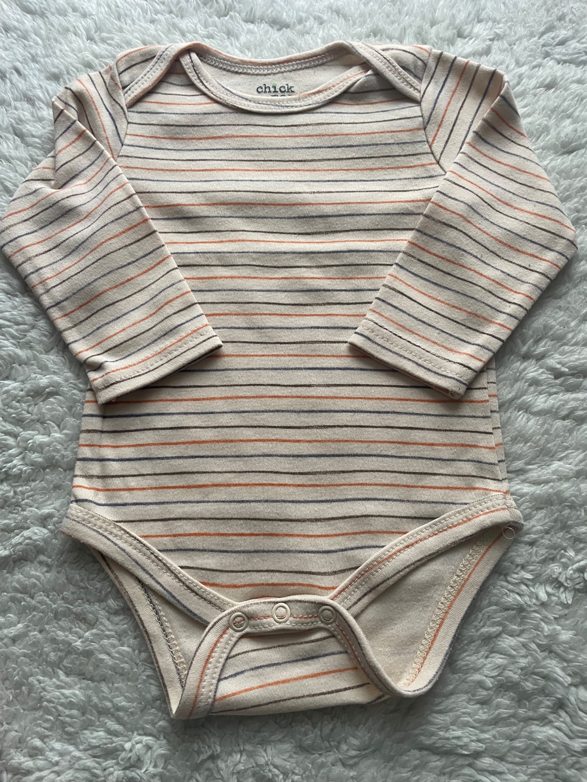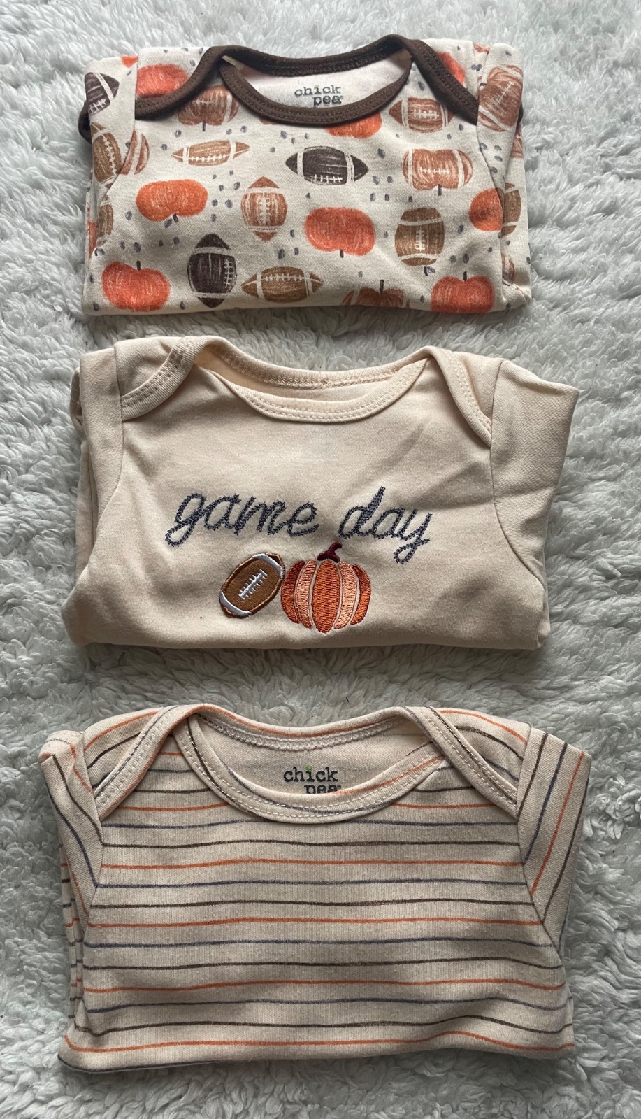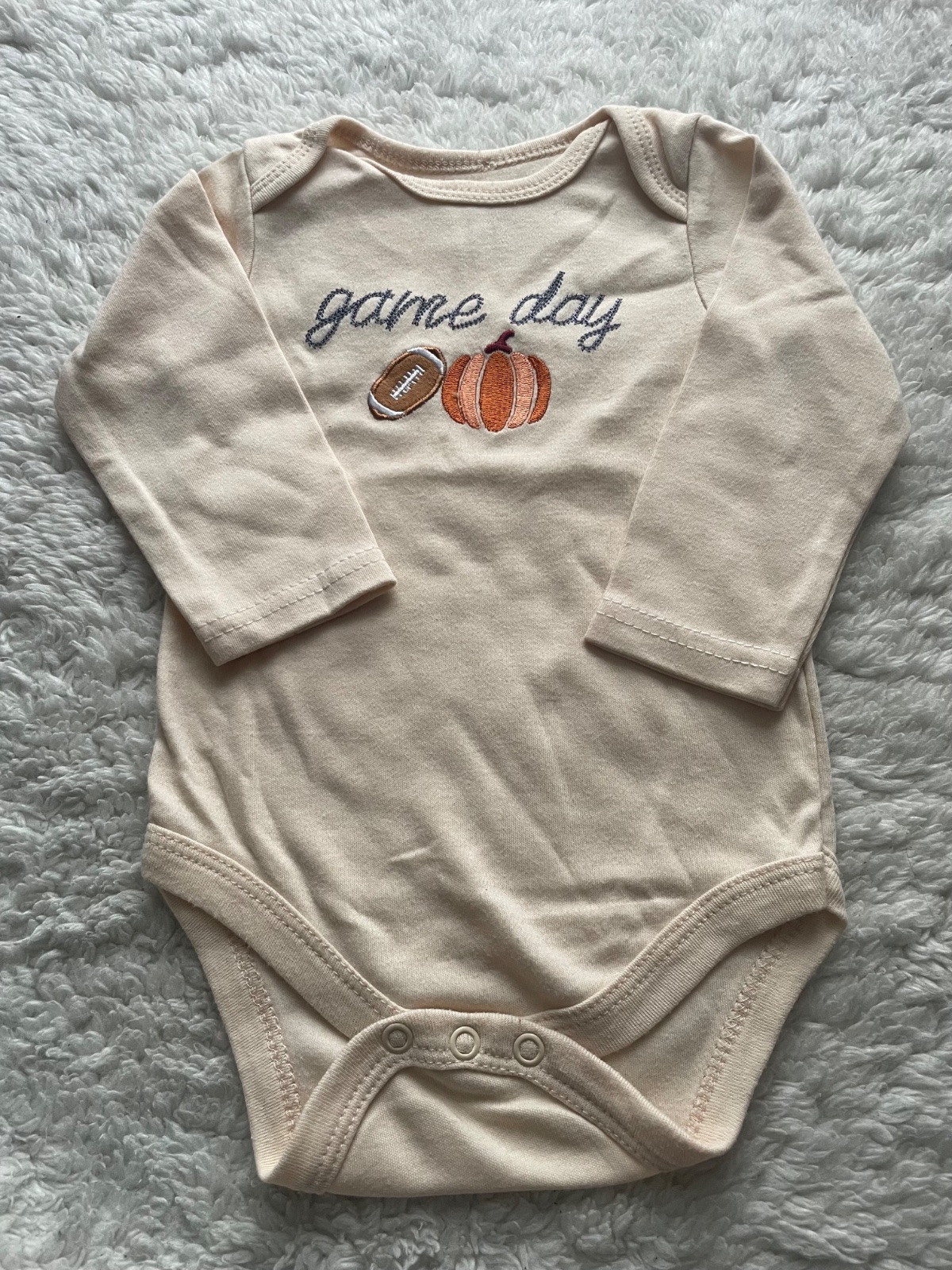 Trio bavlnenych body kremovej farby - pasikave, jablckovo loptove, s napisom game day, makkucky material, malo nosene, neposkodene, velkost 6-9 m