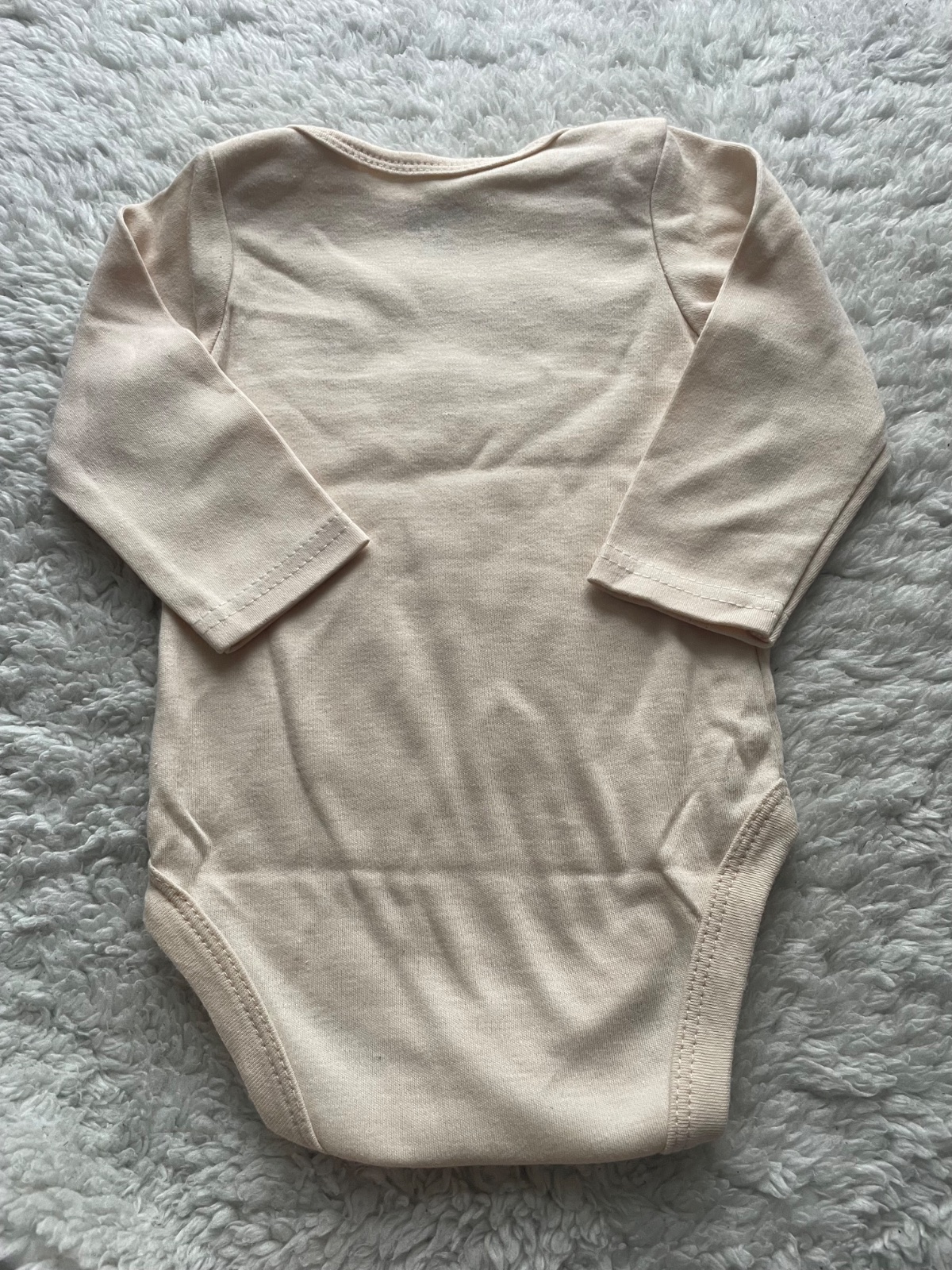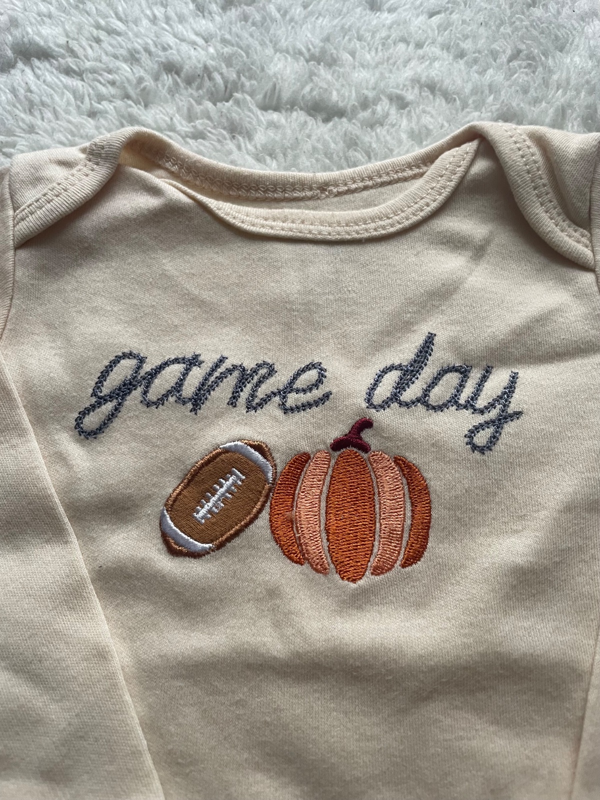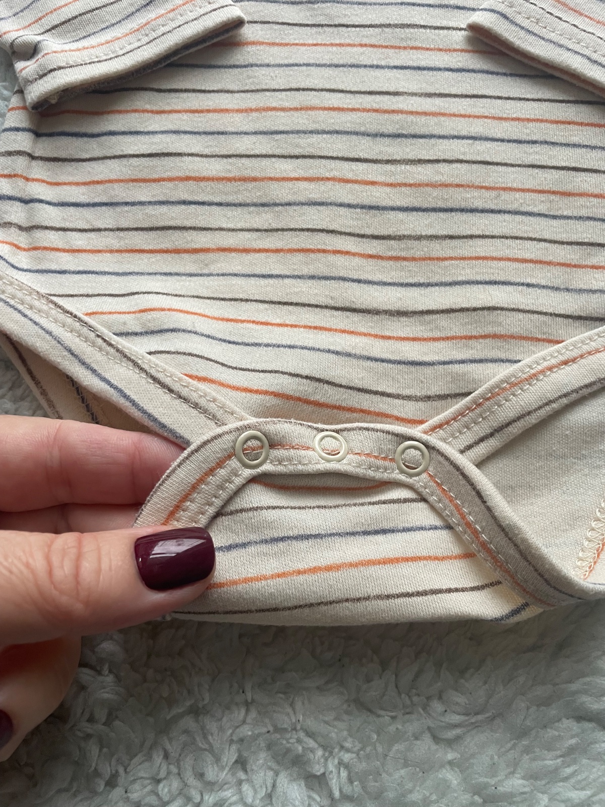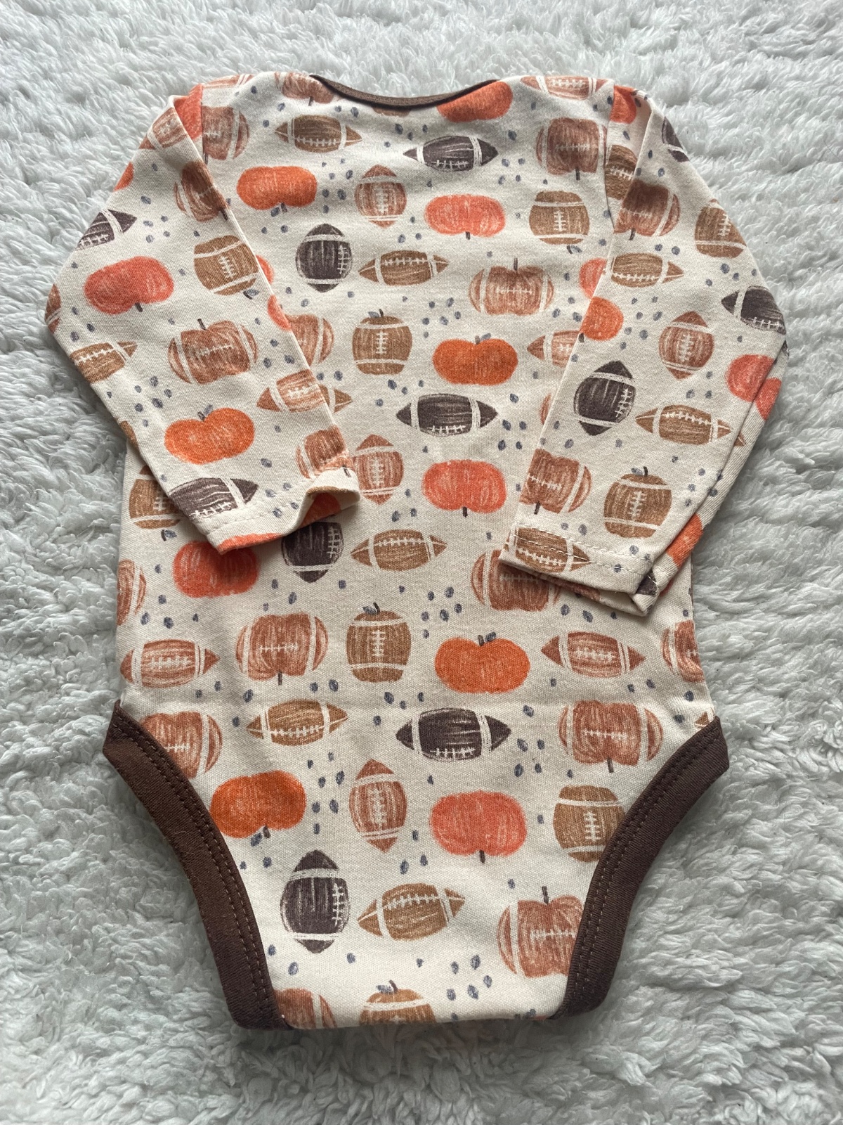 Trio bavlnenych body kremovej farby - pasikave, jablckovo loptove, s napisom game day, makkucky material, malo nosene, neposkodene, velkost 6-9 m