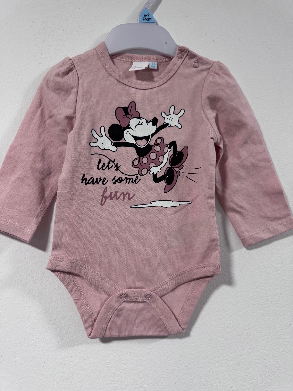 Veľmi dobrý stav! Dievčenské body s dlhým rukávom a potlačou Minnie, jemne elastické, zapínanie na cvoky. ROZMERY: dĺžka: 36cm, od pazuchy dĺžka dole: 18cm - 26cm, dĺžka rukáv od krku: 24cm, dĺžka...
