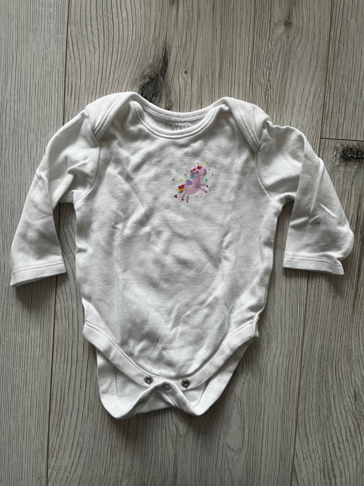 Predám dva kusy dlhorukavovych bielych body s obrázkom jednorožca značky Primark, veľkosť: 68 (3-6 mesiacov)