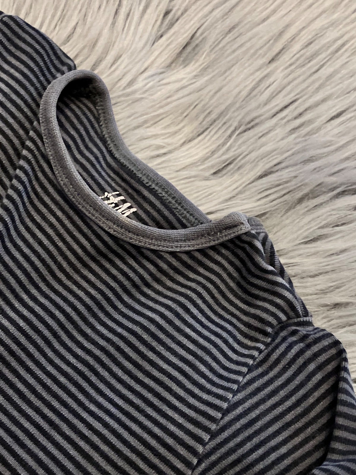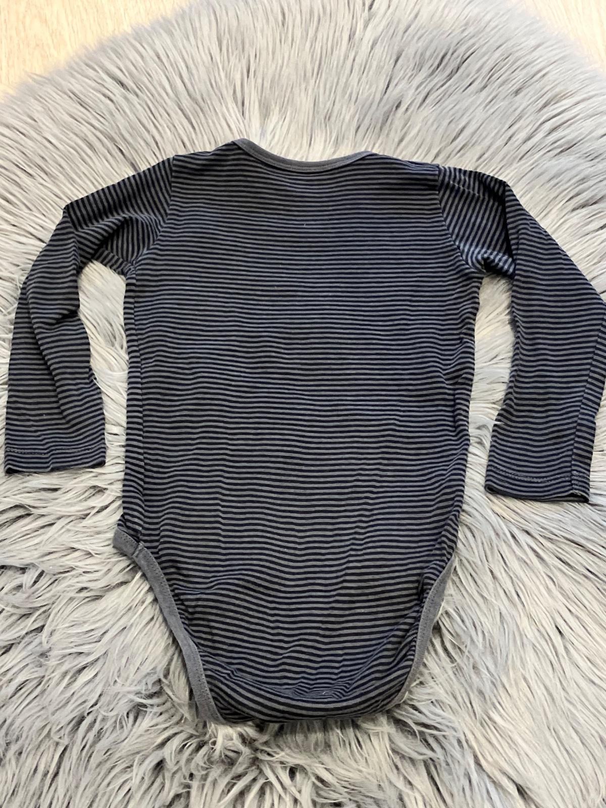 Chlapčenské tmavosivé body s dlhým rukávom, pásikavé, zapínanie na dve cvoky na ramene, elastické, materiál 100%bavlna.
