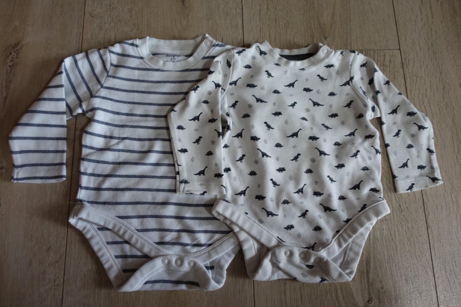 Predám 2 bavlnené body pásikavé a jedno s dinosaurami veľkosť 74 váha do 9 kg. Boli kupované nové, ale sú z rôznych packov. Mali sme ich 1-2x max, ale sú v peknom stave. Obe sú mäkučké, nemajú žmolky. Celková dĺžka body s dinosaurom od pliecka po spodok pri zapnutí body je 36 cm a pásikavé body je 37 cm. Predávam iba spolu. (B)