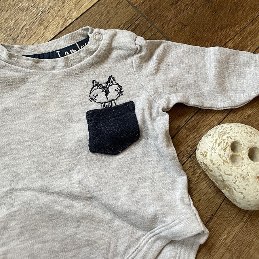 Posúvam toto krásne svetlosivé bodíčko s modrým vreckom a z neho vykukujúcou mačičkou. Bolo kúpené tu na koníkovi, no nami nenosené. Bodíčko je kratšie a širšie. Bolo oprané v prírodnom pracom prostriedku a odložené pre niekoho ďalšieho. :)