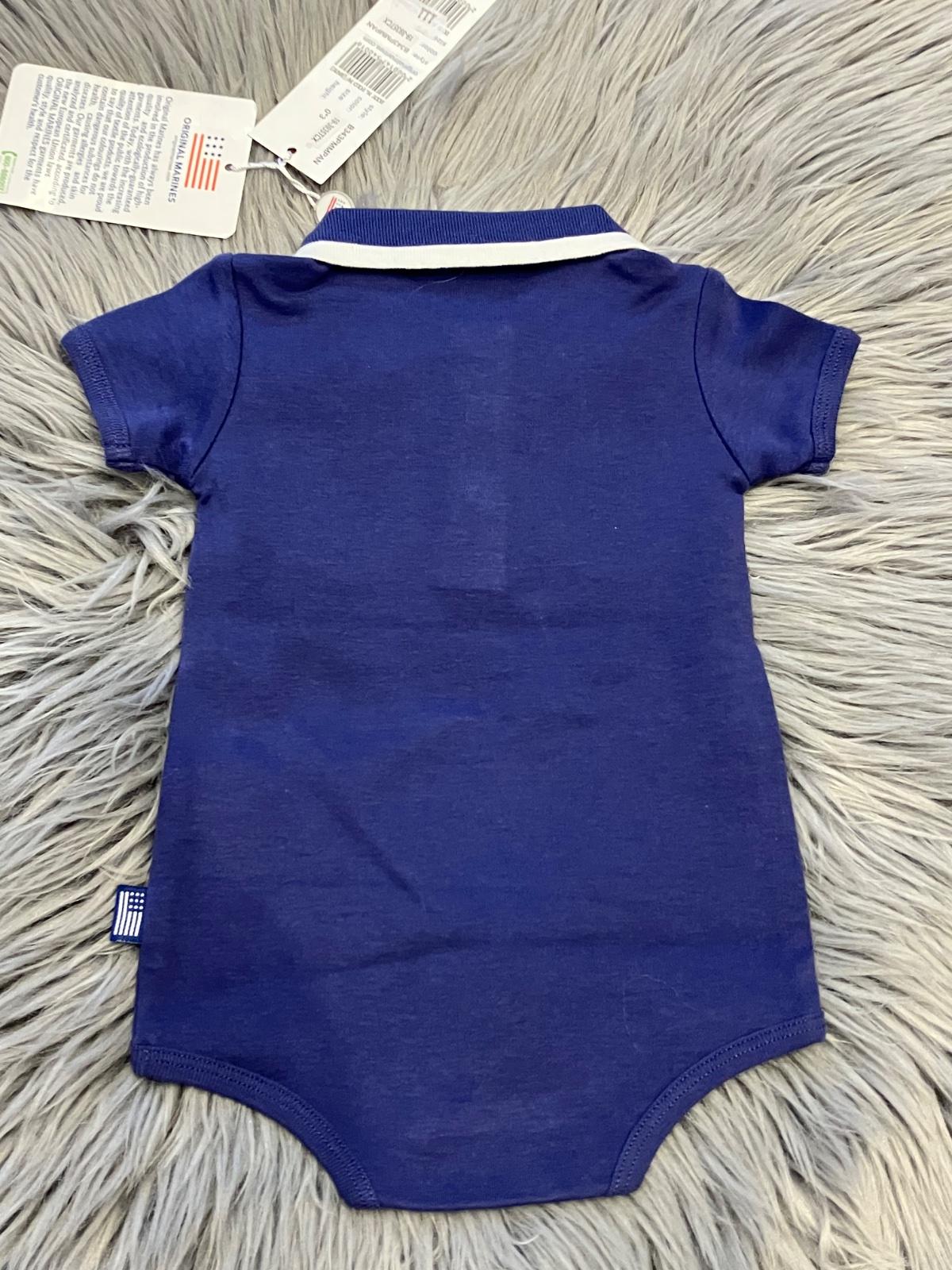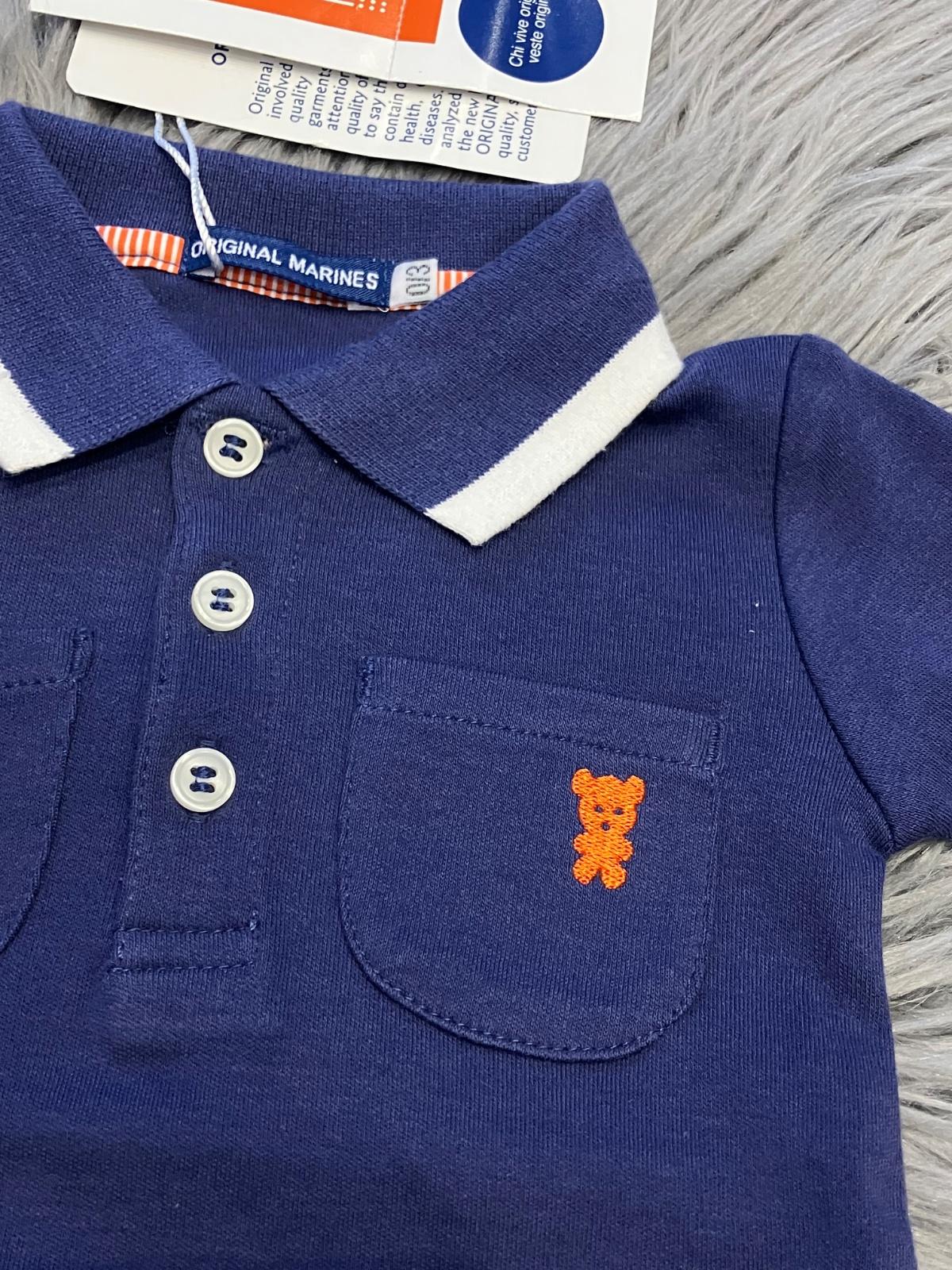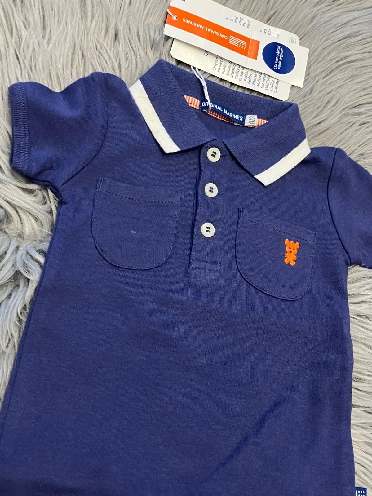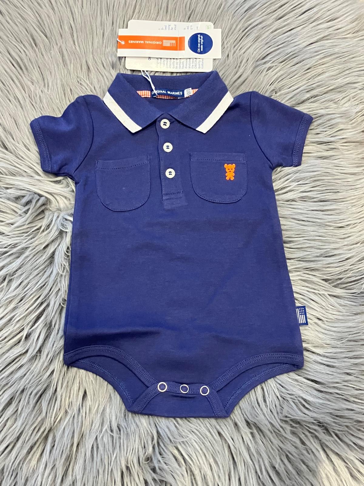 Chlapčenské tmavomodré body s krátkym rukáv , vreckami a vyšívaným vzorom macíka. Zapínanie na tri gombíky a na cvoky. Elastické. Materiál: 100%bavlna.