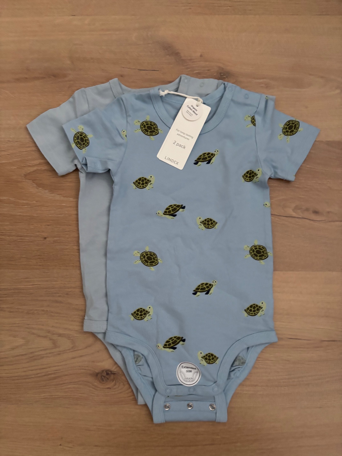 2 ks letne body Lindex - modre a korytnacky. Veľkosti 74 a 80