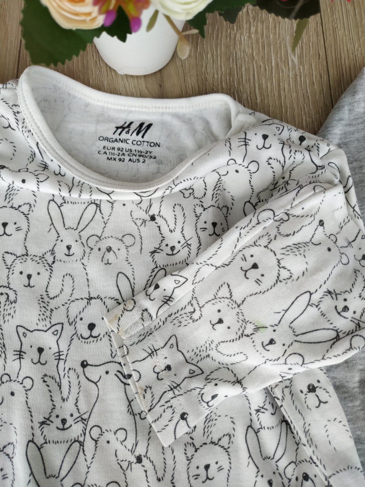 Nosené body značky H&M, veľkosť 92. Béžové so zvieratkami v peknom stave až na fliačik na rukáve. Sivé viac nosené - fliačiky. (viď. foto). Cena spolu 2,50 € + pošt.