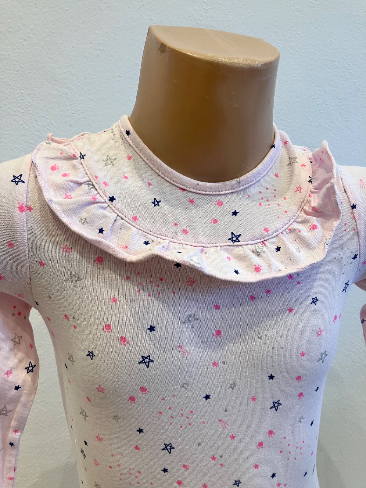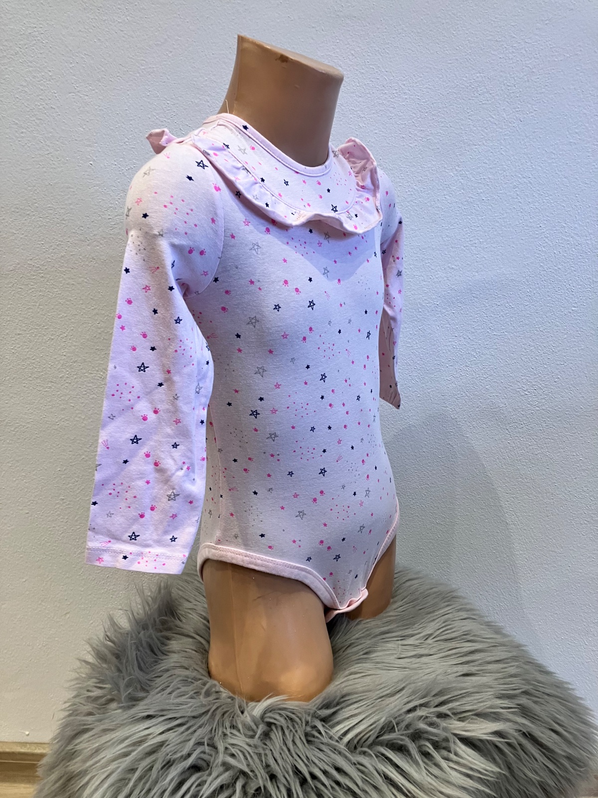 Dievčenské body s dlhým rukávom, hviezdičkami a volánom, zapínanie na cvoky, elastické, materiál 98%bavlna 2%elastan, SO CUTE.