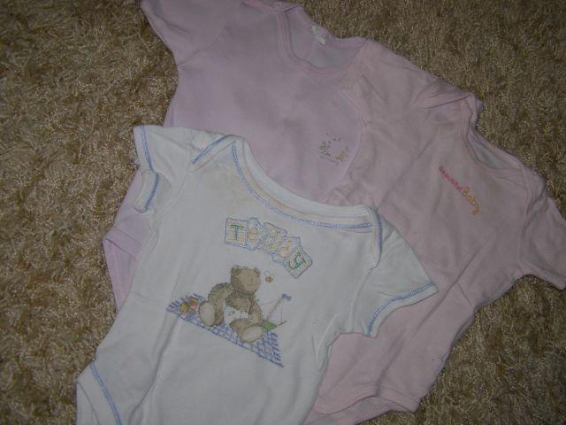 Biele je značky Marks and spencer s milučkým medvedíkom. body boli odžmolkované - sem- tam má mini šitie od zatrhnutia odžmolkovača. Sem tam vyblednuté fľaky. ostatné sú rozne značky. Na jednom sú se tam jemné fliačiky. Vhodné sú na donosenie na doma, ak Vám nevadí, že sa dieťa zašpiní. Inak materiál je veľmi kvalitný.