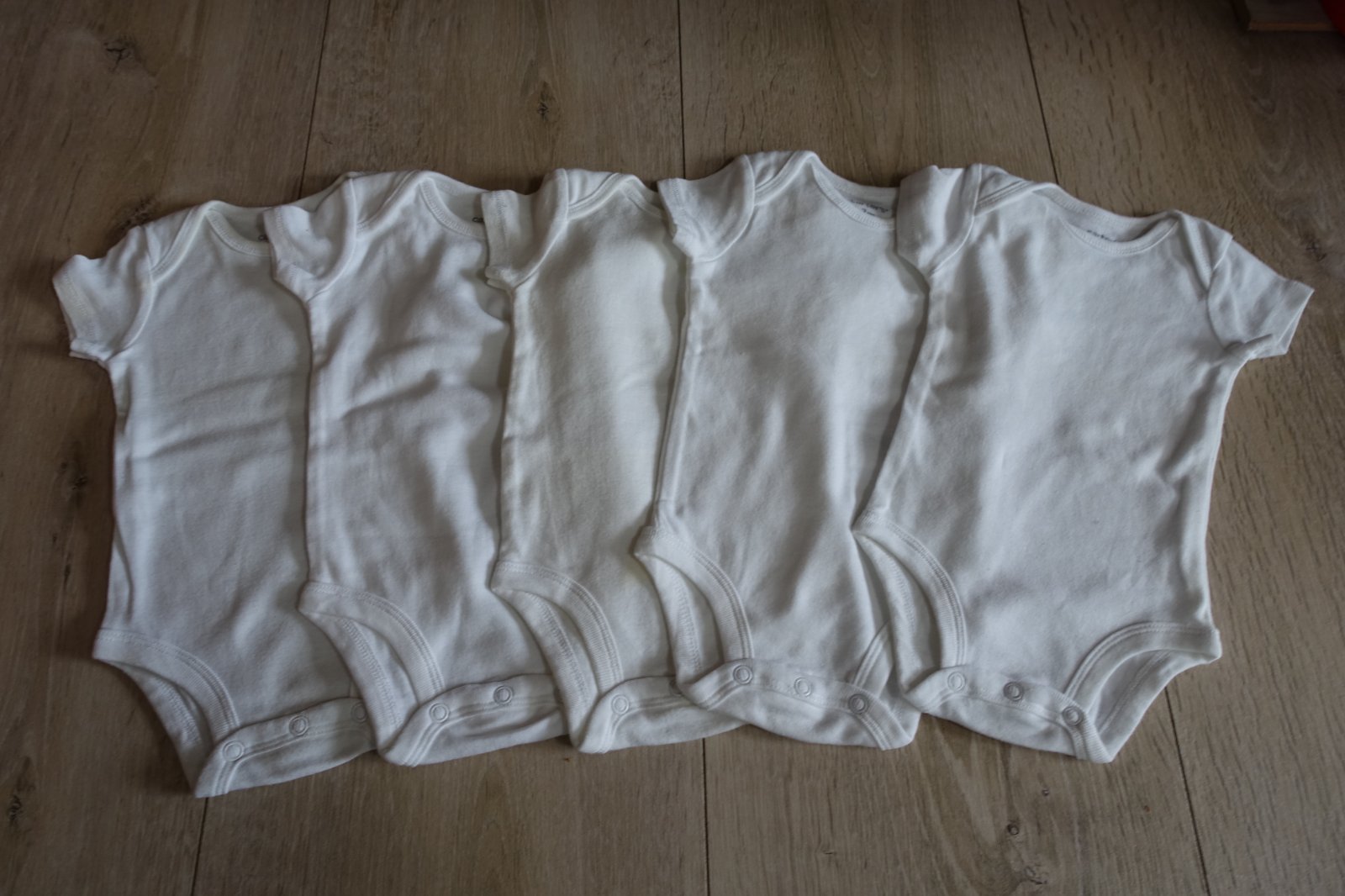 Predám bavlnené body všetky vo veľkosti 3M (sedí na našu 56). Mali sme ich iba pár krát oblečené, mali sme toho veľmi veľa, nestíhali sme všetko nosiť. Nemajú ani žmolky, ani diery. Niekde je vidno chĺpoček z prania pri naklonení, ale len minimálne a len pri naklonení, nie sú žmolkavé. Na jednom bodičku som našla na pliecku žltý fliačik, vidno ho len pri naklonení.. Možno ešte pôjde vyprať. Ostatné sú pekné. Celková dĺžka body od pliecka po spodok pri zapnutí je 36 cm. Predávam iba spolu. (B)
