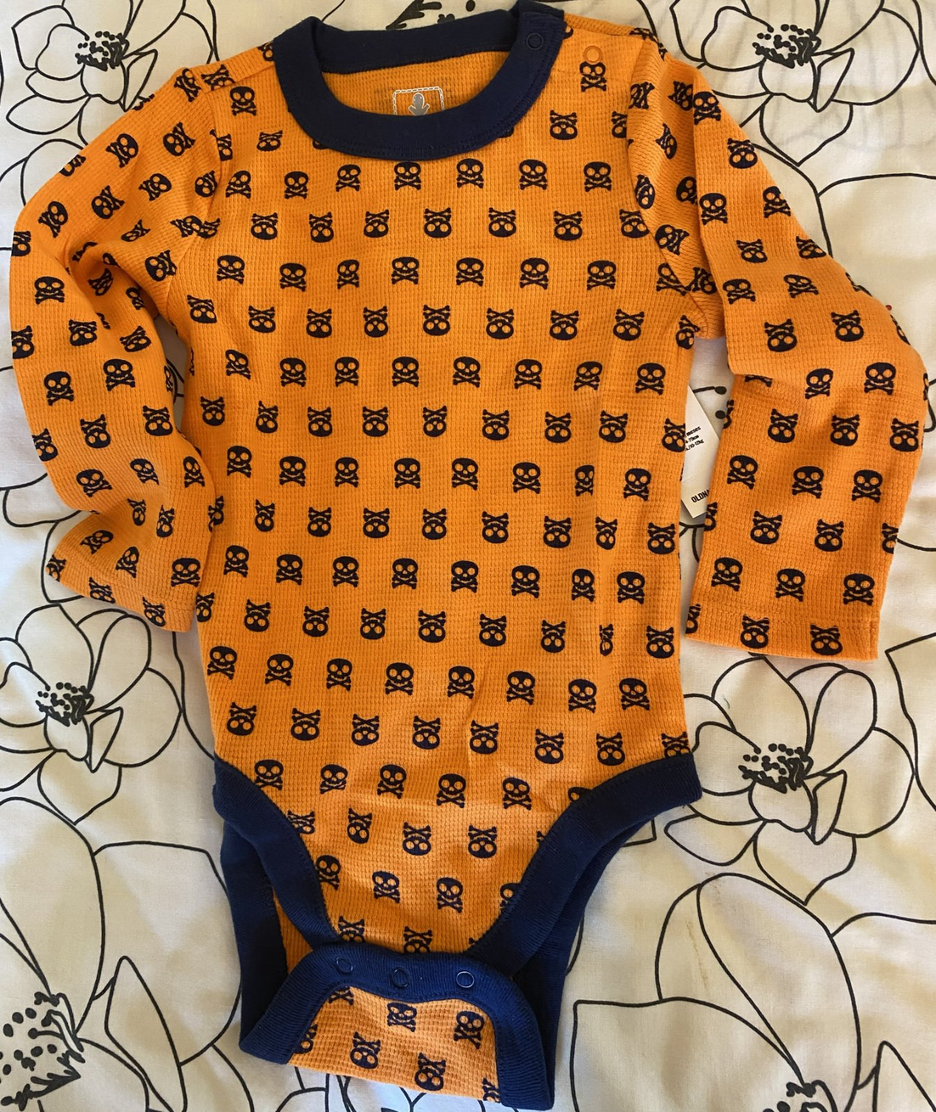 Halloween body OLD NAVY v. 86 - 12-18 mes. - UNISEX, oranžové s motívom lebiek, 100% bavlna. Veci tejto značky nemajú vnútorné visačky, aby neškrabali, všetky nápisy sú vo vnútri nažehlené.