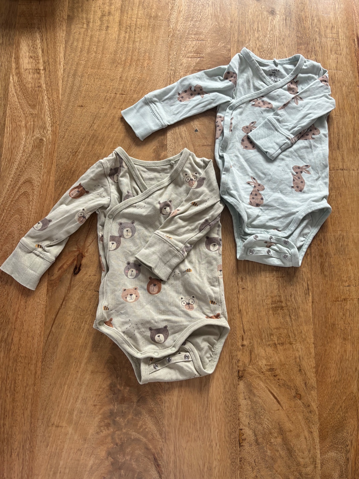 2x body - zavinovacie vo vzore zajace a mackovia. Obe su velkosti 56, nosotelne velmi dlho. Bez dier a flakov, pekny stav.