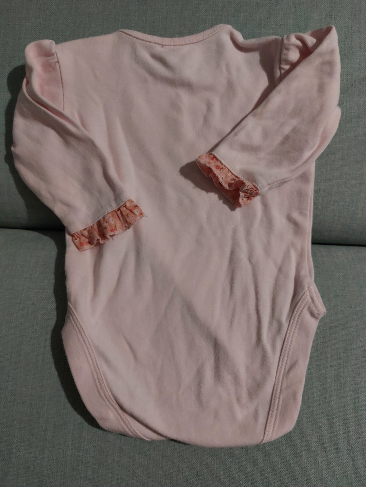 Ruzove body s volanmi na rukavoch, velkost odhadom ,nepamätám, vid dlzka foto. Farba je taka cukríkova ruzova, ale nie taka svietiaca ako fixky.