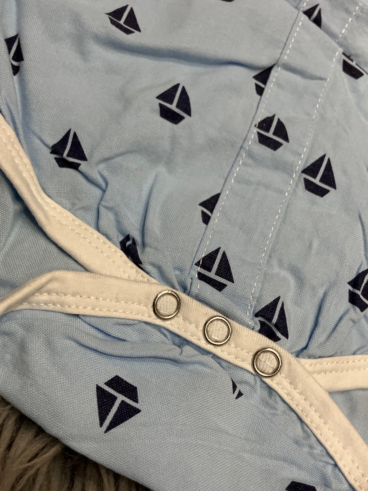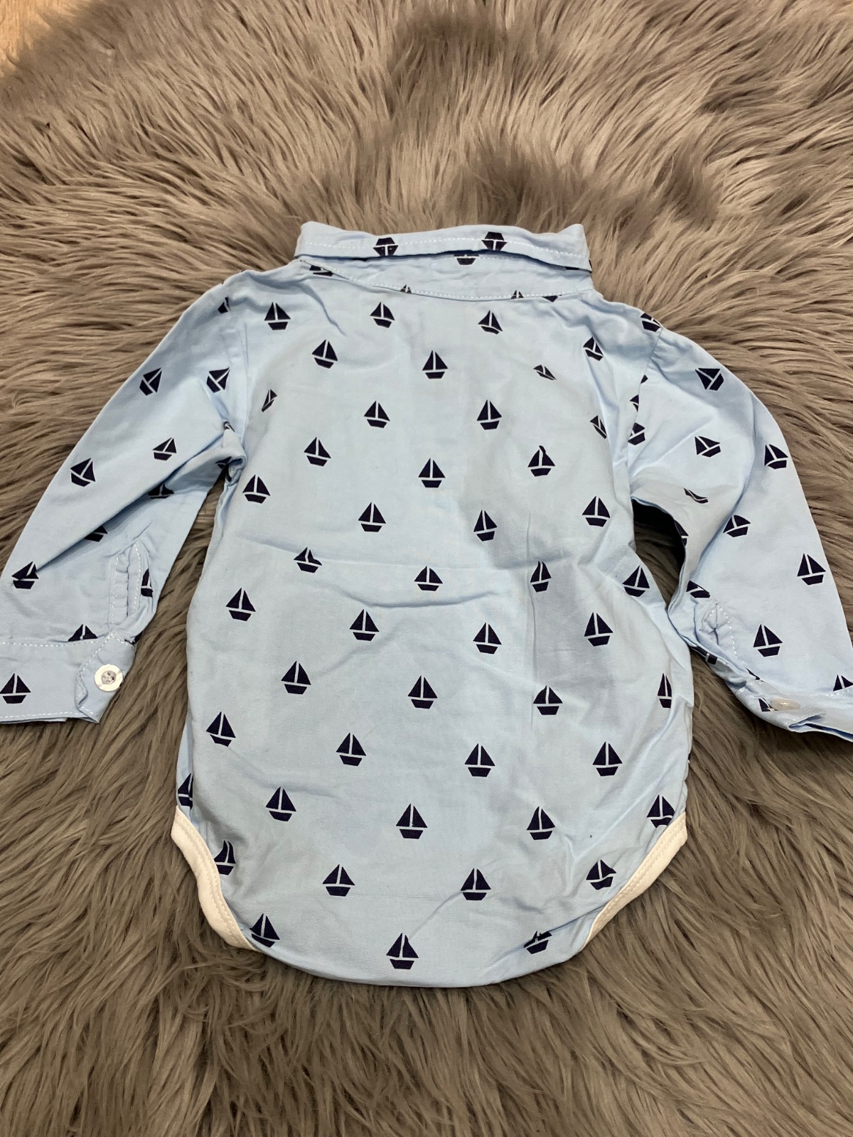 Chlapčenské košeľové body s dlhým rukávom, golierom a neodnímateľným motýlikom na výstrihu, zapínanie na dve gombíky a na cvoky, jemne elastické, materiál 95%bavlna 5%polyester. Veľkosť cca 74.