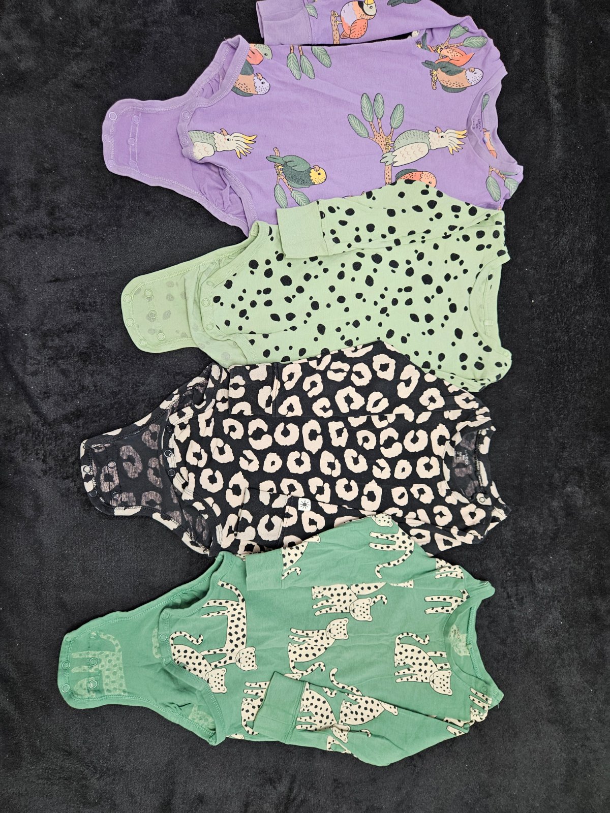 Nosene, stale pekne. Papagaje a bodky su z chybnej serie a maju miesto cvoku pri krku nasity suchy zips, pri noseni nevidno. Zelene leopardy bez chyb, cierne body sa zafarbilo pri prani, inak pekny stav, nesprane, cierna je stale syta. Cena spolu.