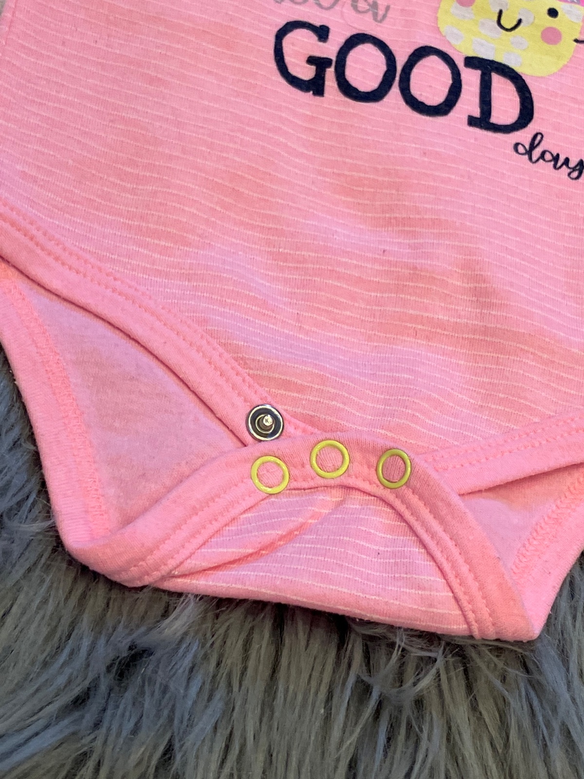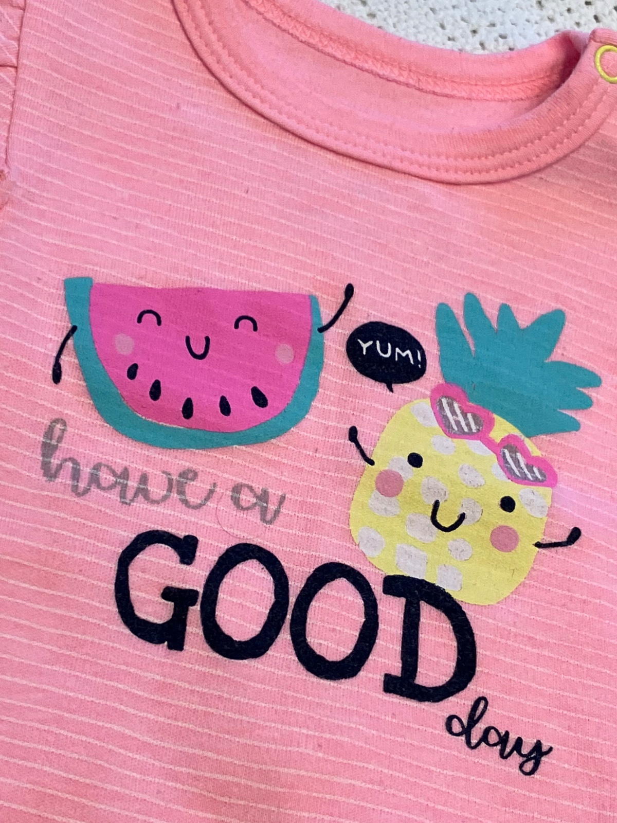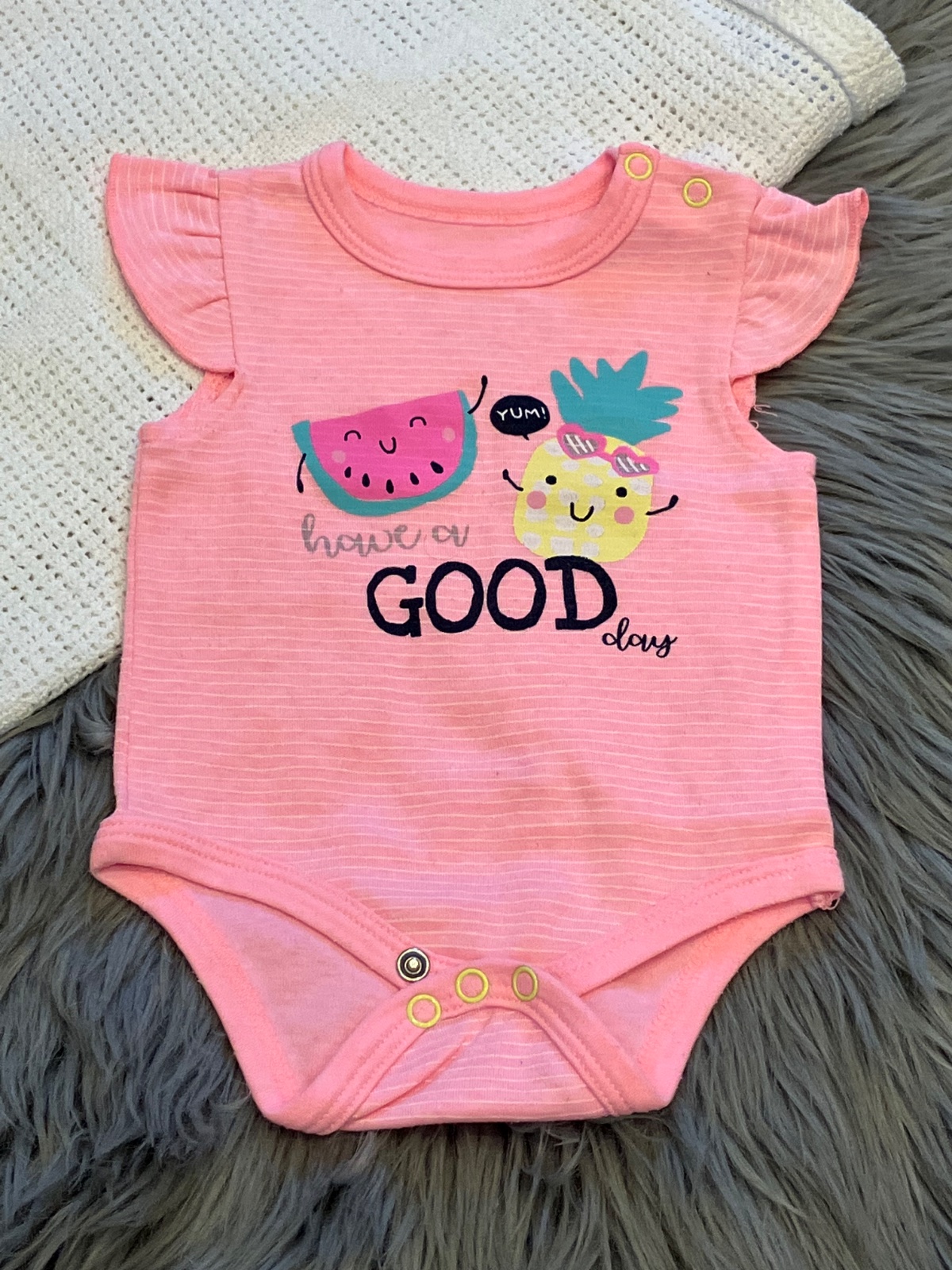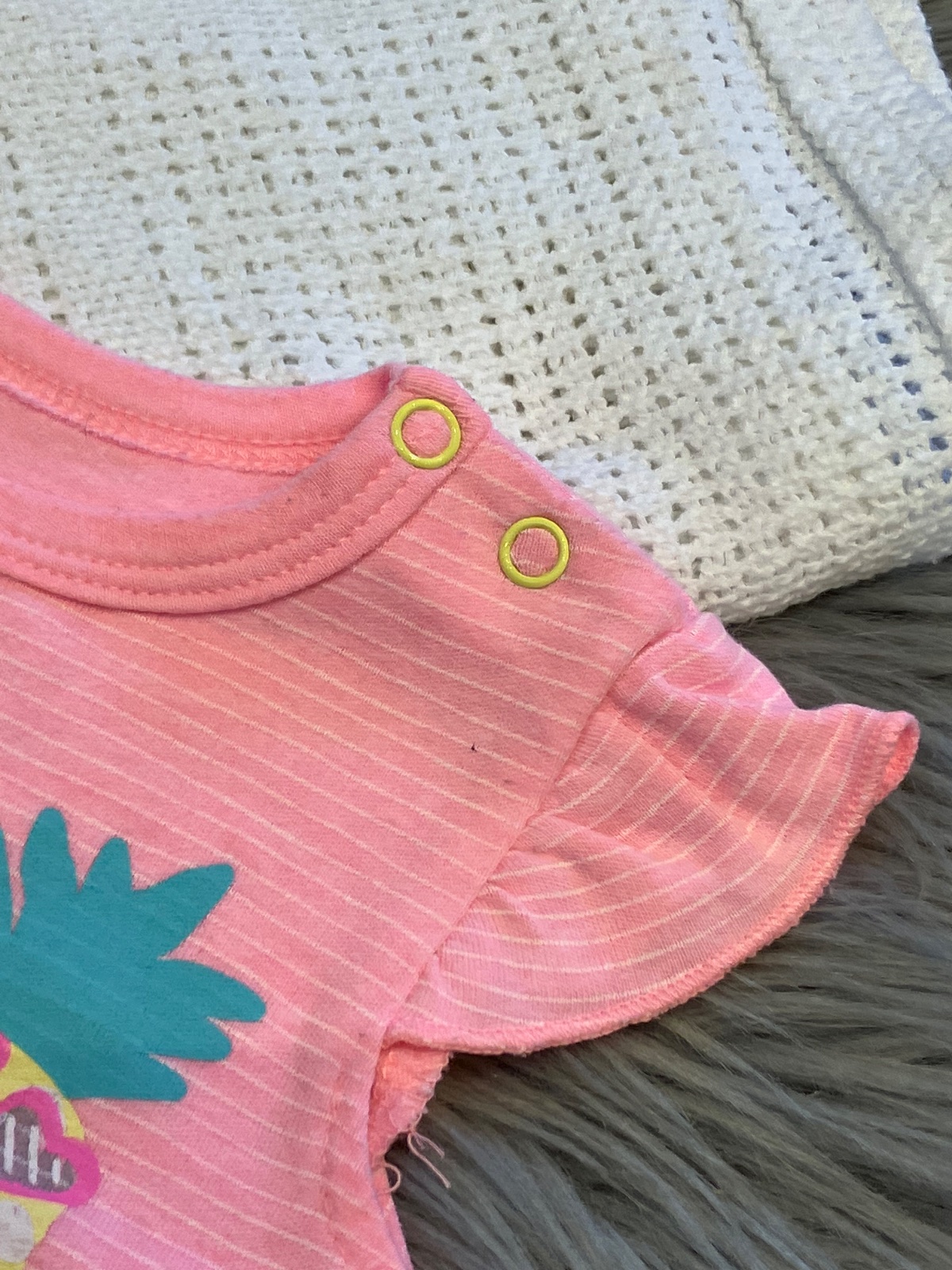Dievčenské body s krátkym rukávom a potlačou, nápismi, volánové rukávy, neónovo ružové s bielymi pásikmi, zapínanie na spodku na cvoky, cvoky sú neónovo zelené, elastické, materiál 60%bavlna 40%polyester.