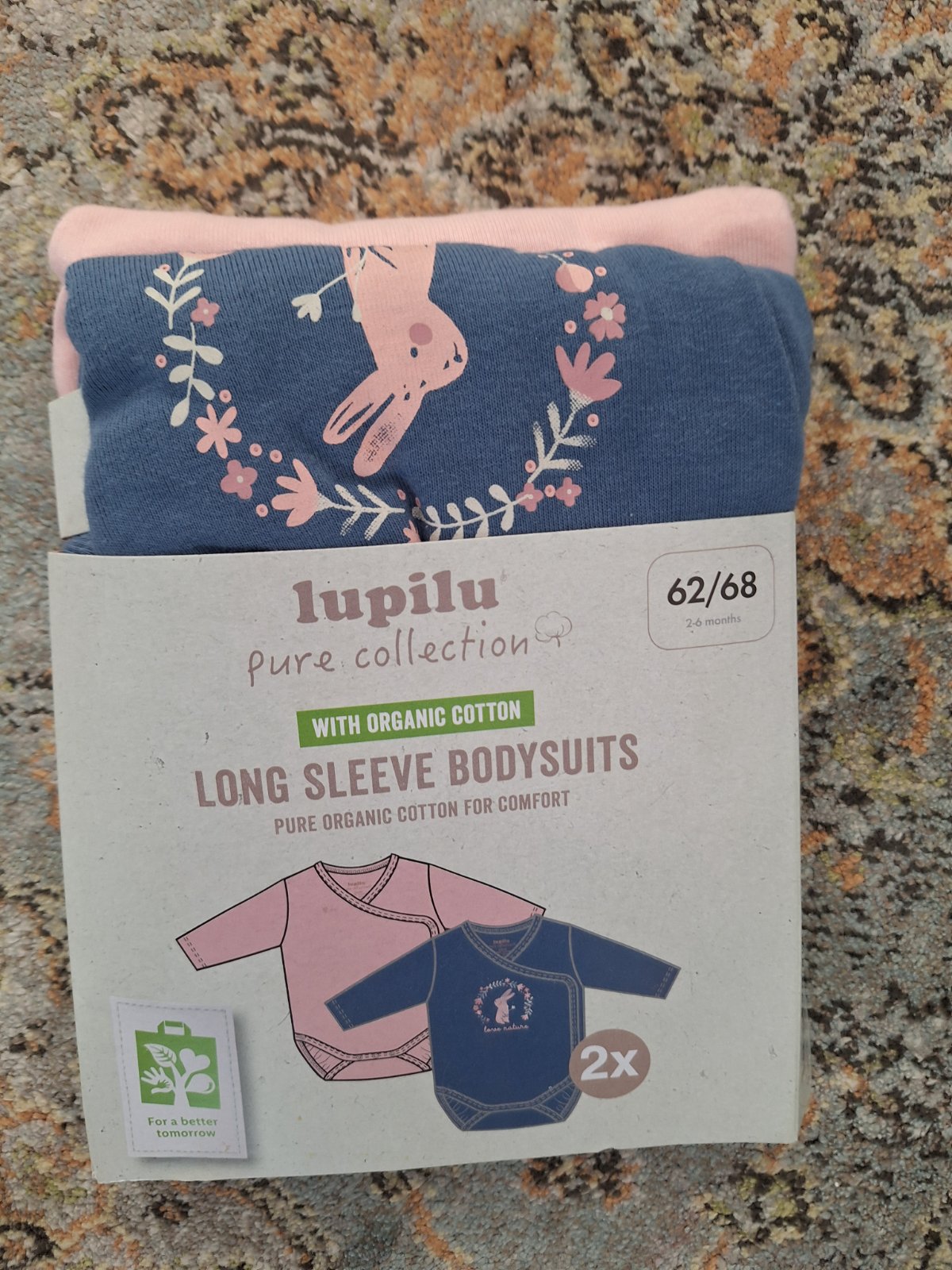 Skvele body lebo sa neprevlieka cez hlavičku so zapínaním spredu. Je to dvojčíslo 56/62, nám to sedelo keď sme nosili 62ky. Cena za obe spolu