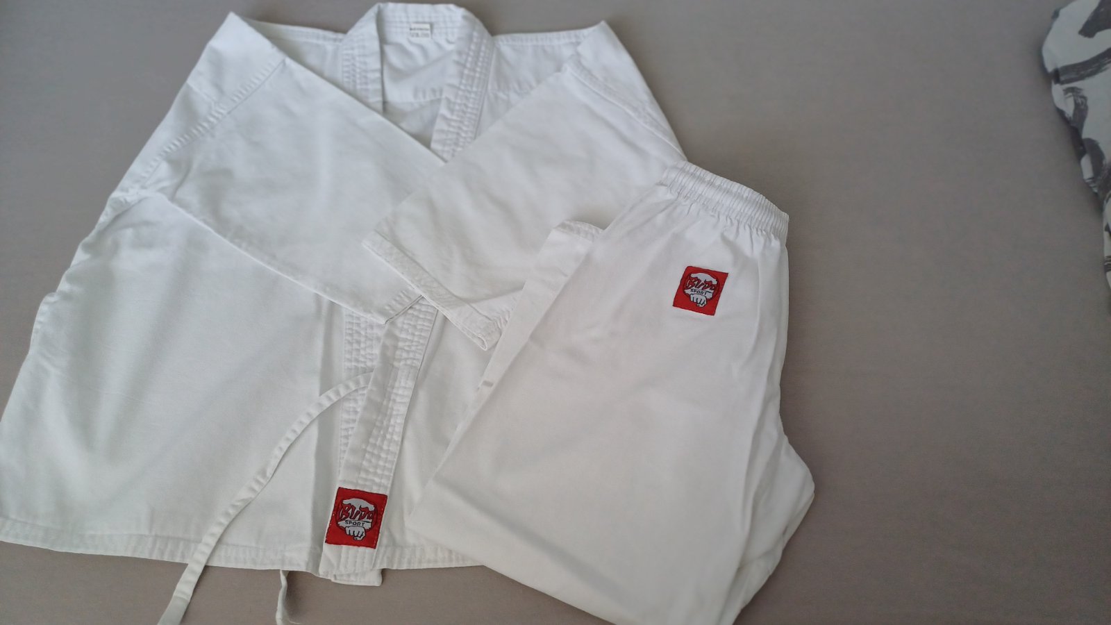 Predám kimono pte dievča alebo chlapca vo veľkosti 130, na ľavej strane je trošku vidieť taký štvorček, bolo tam našité logo klubu, viď fotka