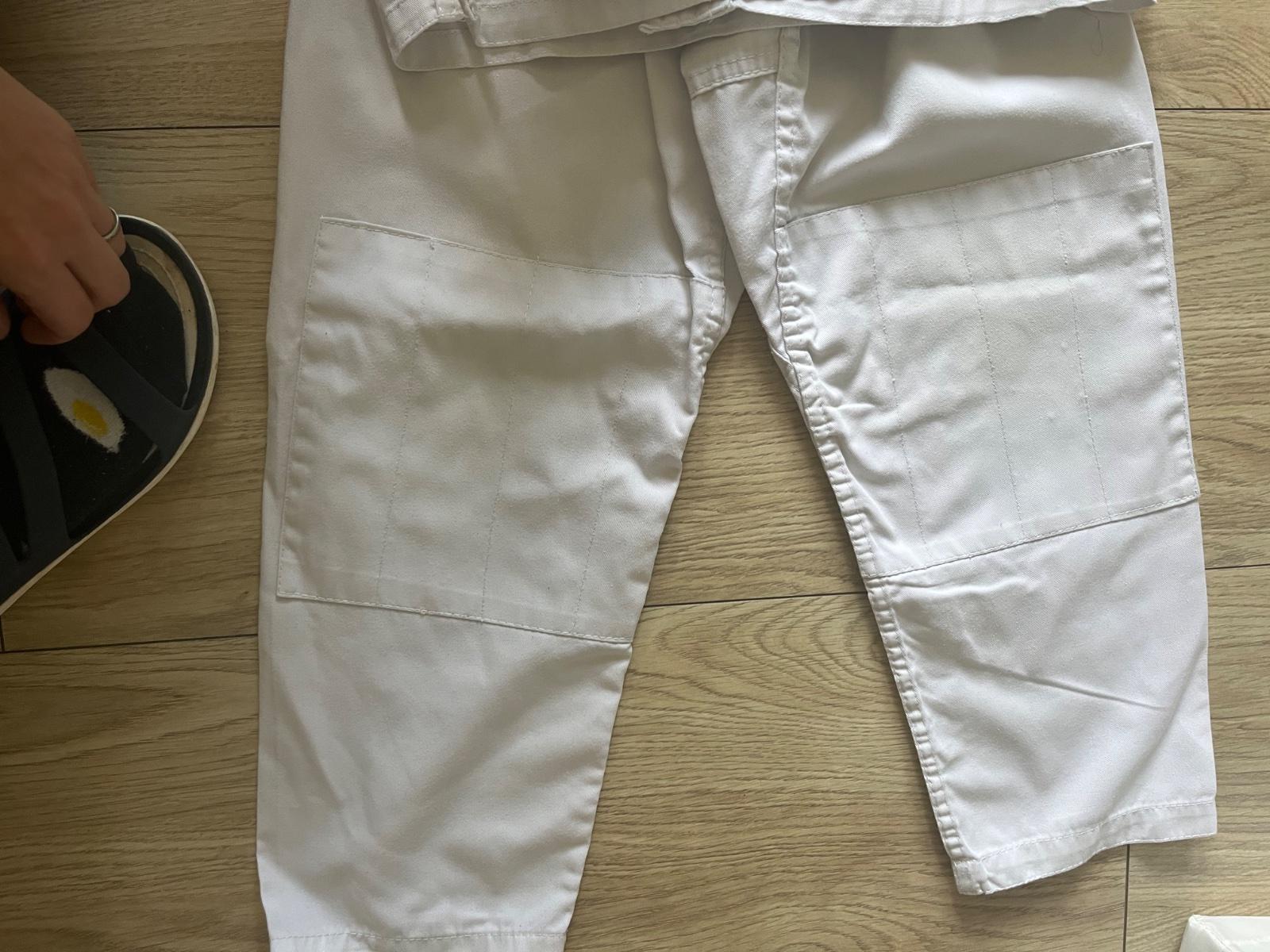 Zachovale nesprane zaciatocnicke judogi, s bielym opaskom,