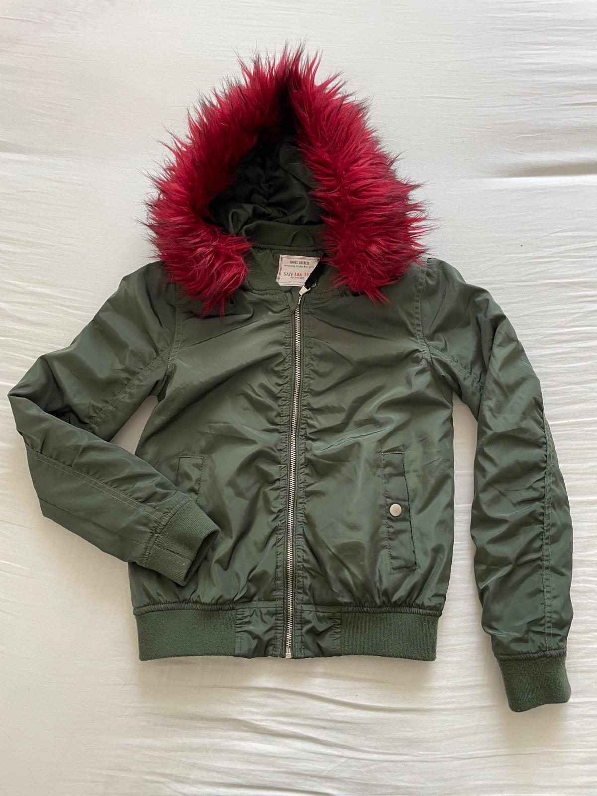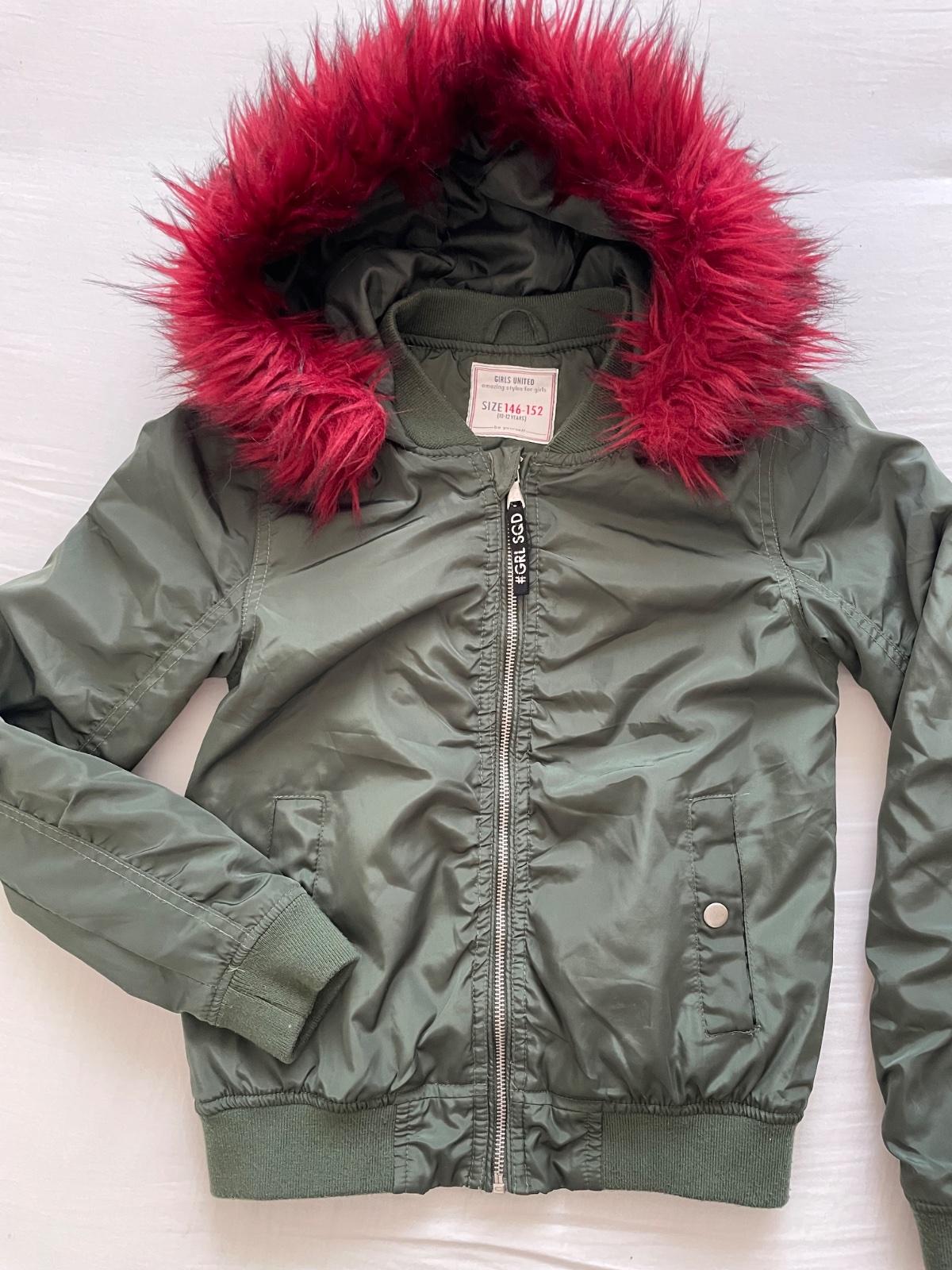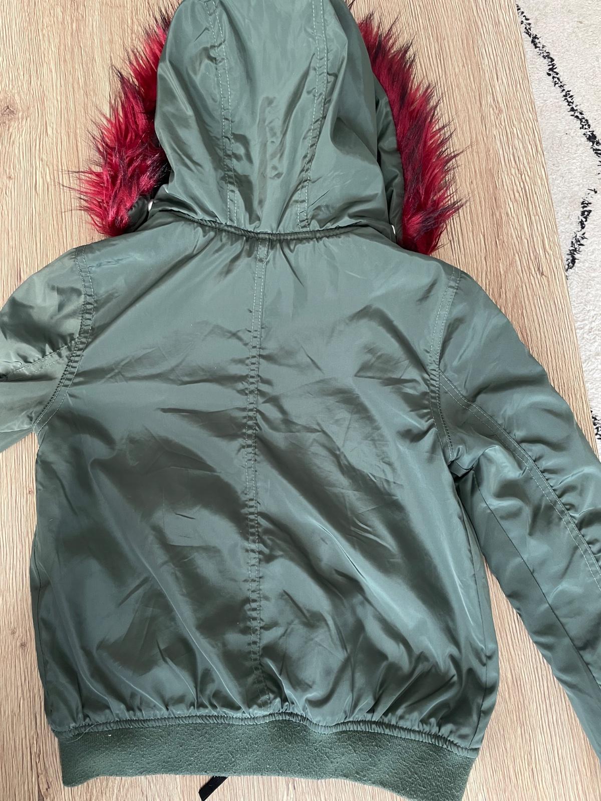 Štýlová bundička krátkeho strihu s peknou červeno-ružovou kožušinkou na kapucni. Dá sa odopnúť. Rozmery na foto. Reálna farba ako na 4.fotke. Malé žmolky na patentoch, váčšinu som už odžmolkovala.
