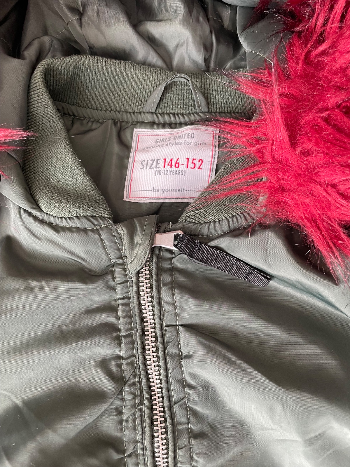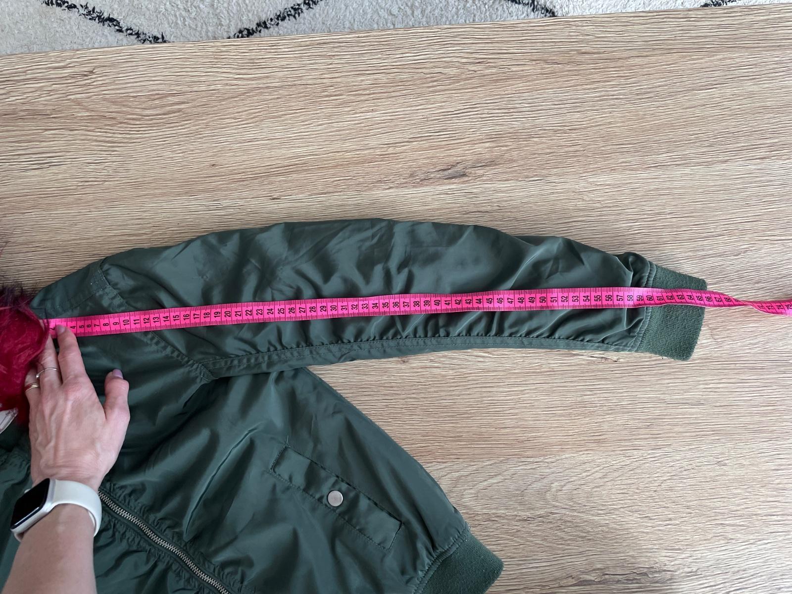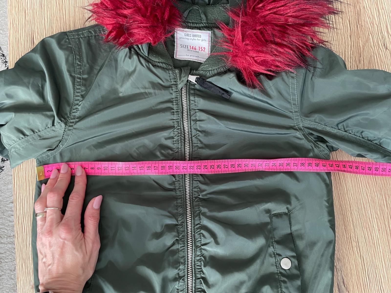 Štýlová bundička krátkeho strihu s peknou červeno-ružovou kožušinkou na kapucni. Dá sa odopnúť. Rozmery na foto. Reálna farba ako na 4.fotke. Malé žmolky na patentoch, váčšinu som už odžmolkovala.