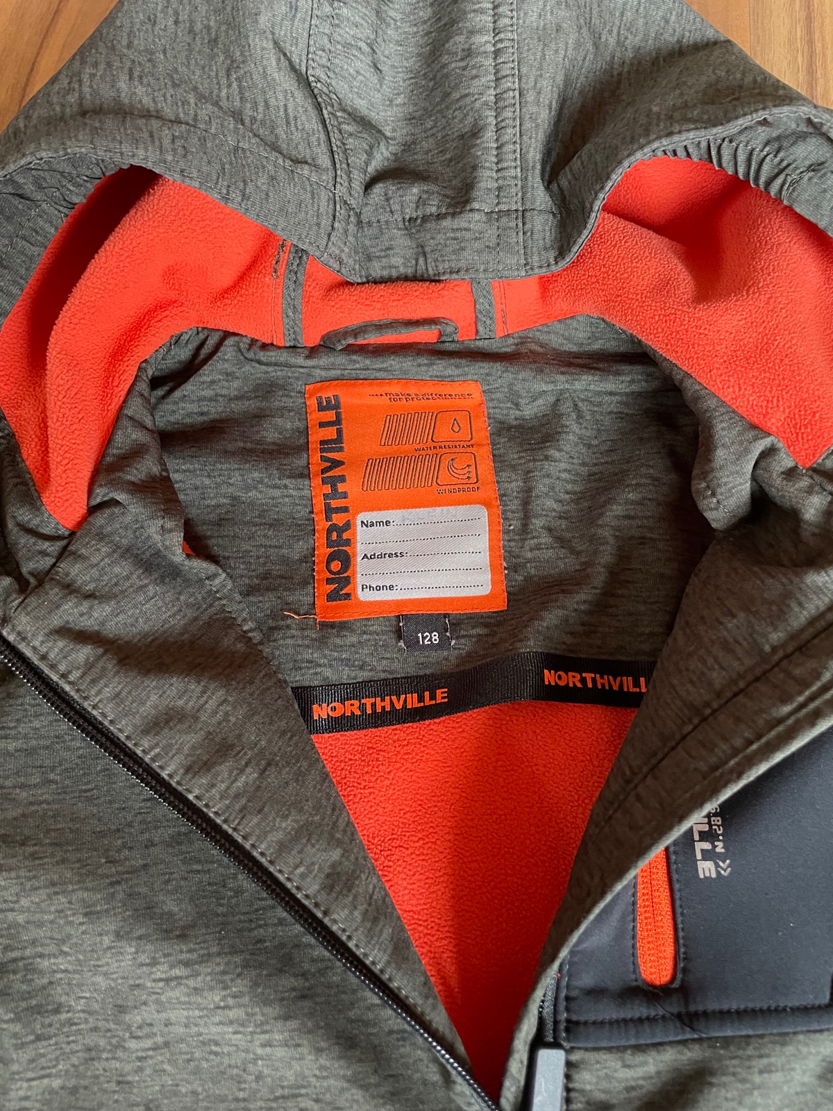Vodeodolná bunda, akoby jemne pogumovaná. Nie je to pršiplášť ale v miernom daždi niečo vydrží. Ideálna na jeseň, jar ale aj v miernej zime sme nosili. Poškodenia nemá, nosená bola na striedačku. S...