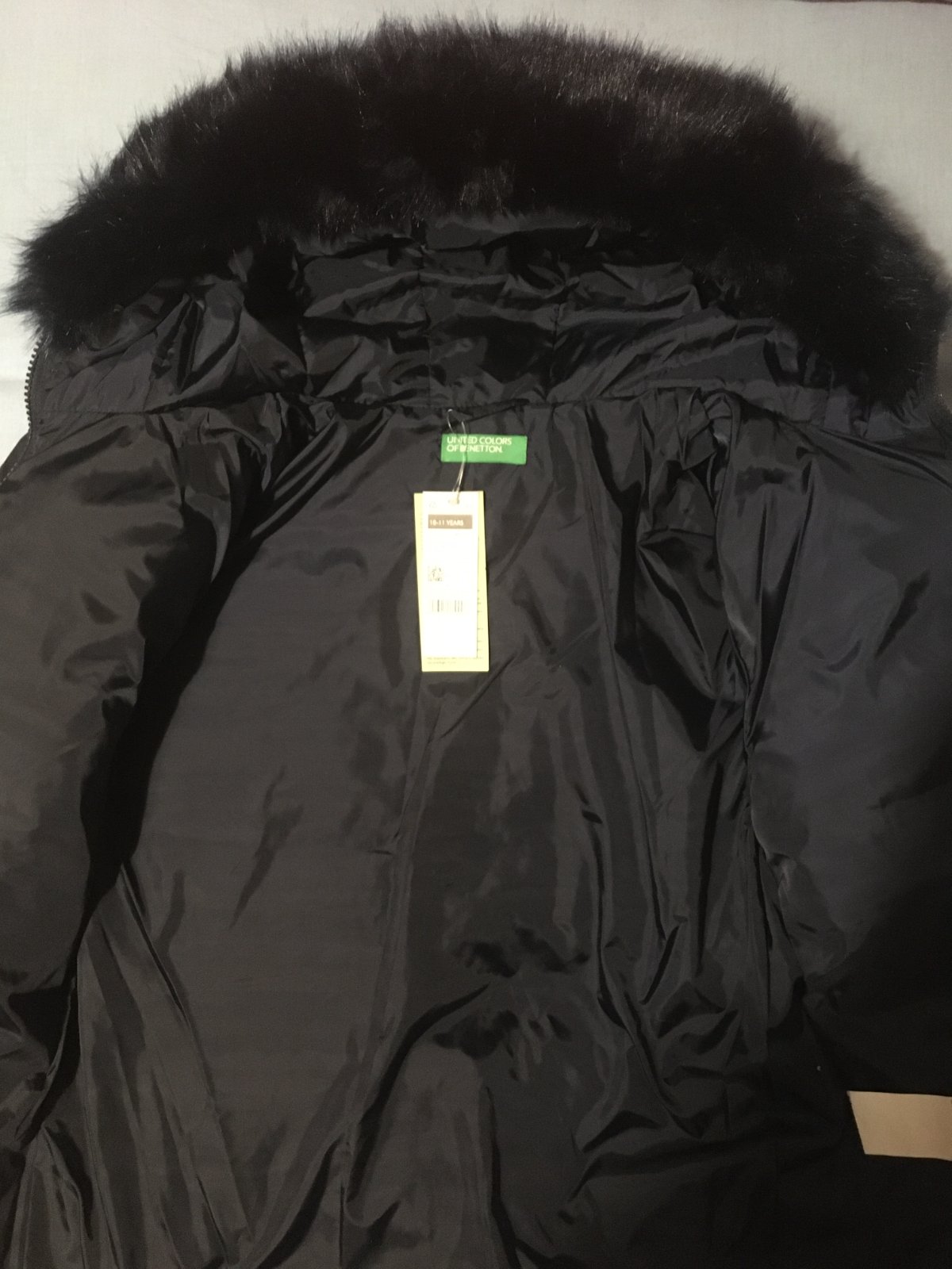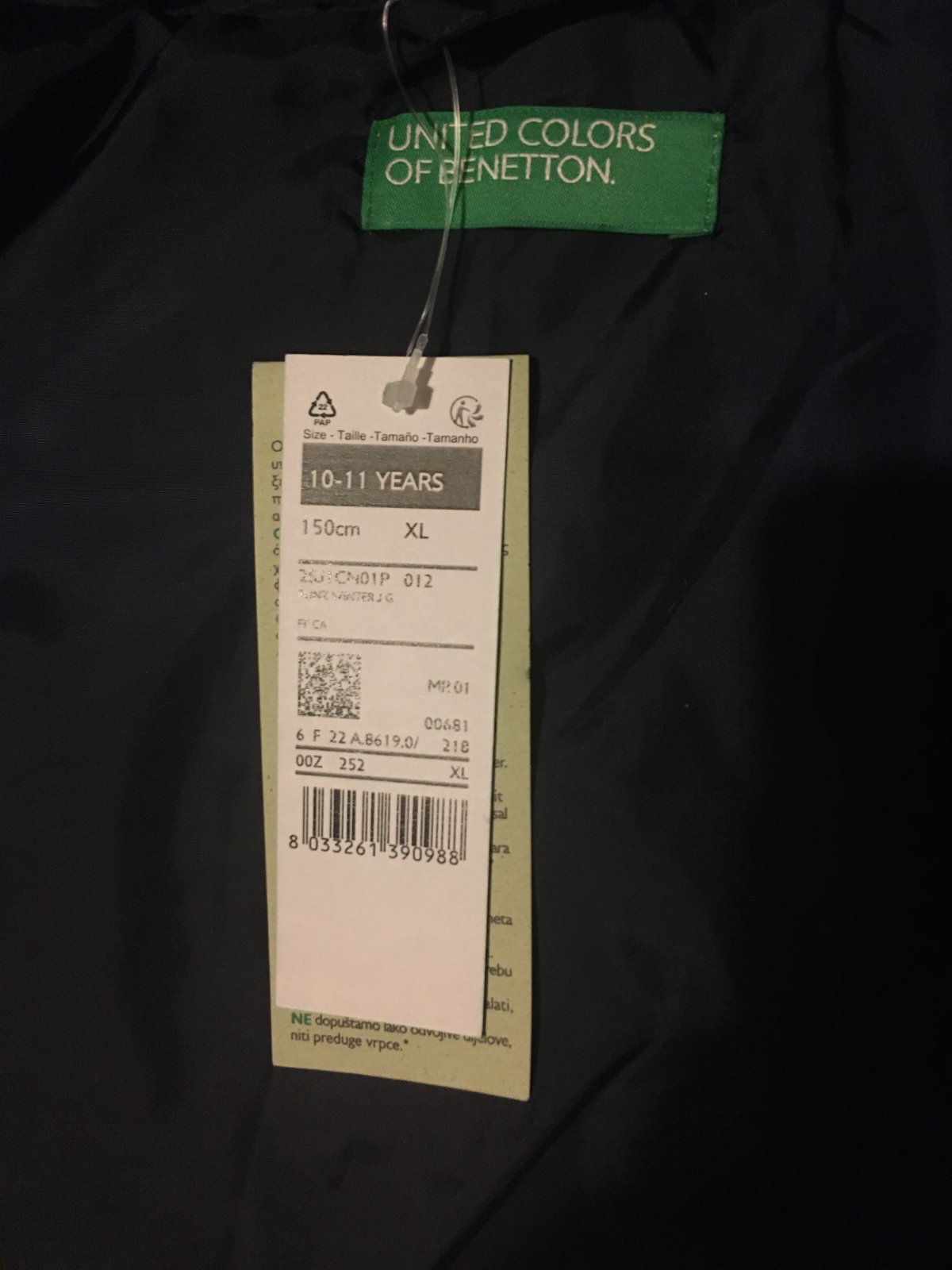 Nová, ešte s visačkou. Krásna tmavomodrá teplá zimná vetrovka značky Benetton vo veľ. XL (150) - reálne zodpovedá veľkosti 146. Mierne predĺžený strih, so šnúrkou na stiahnutie v páse, s odnímateľnou kožušinkou na kapucke. Rozmery: šírka medzi pazuchami 49cm, celková dĺžka 60cm, dĺžka rukáva od prešitia na ramene 51cm.