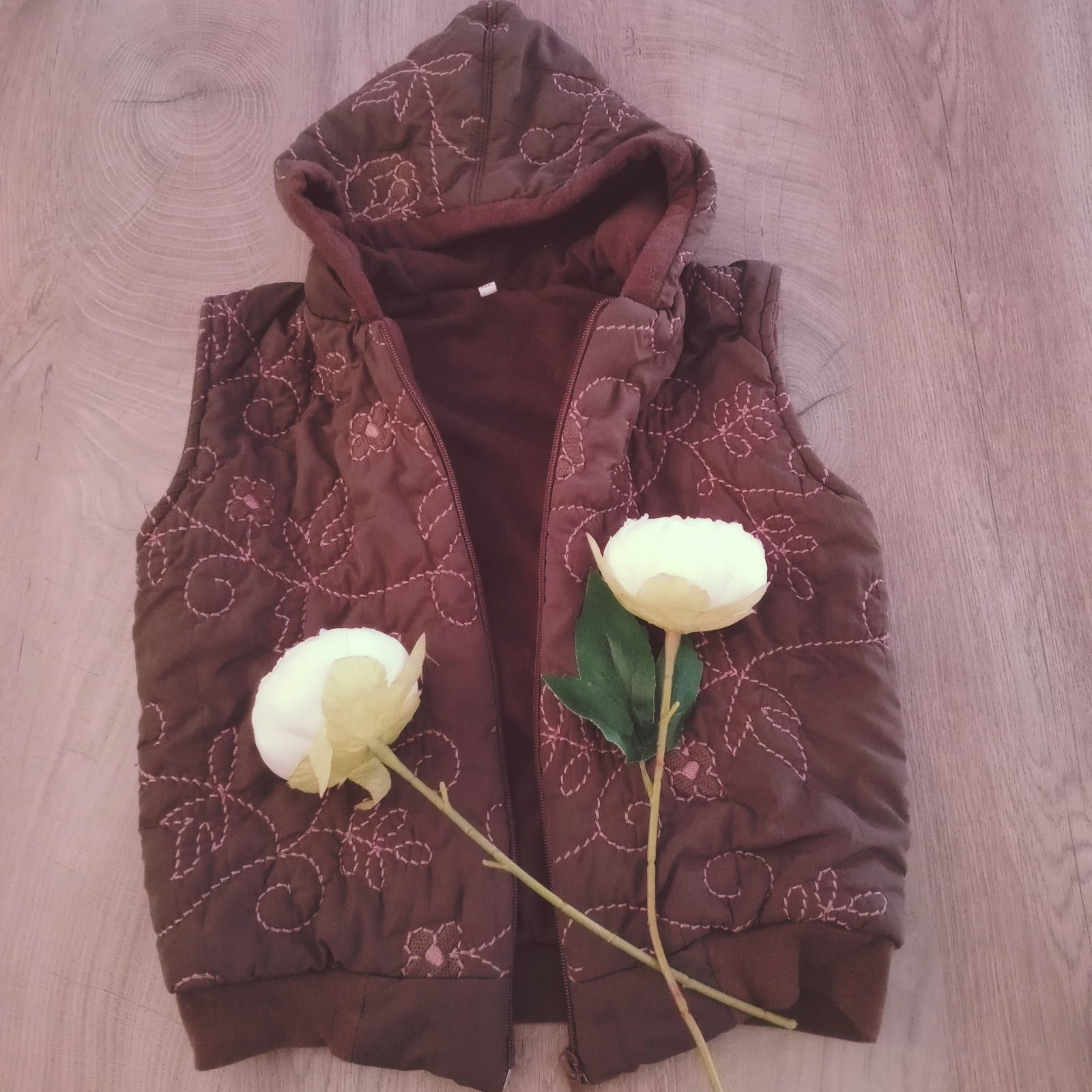 Nosená svetlučko šedo hnedá zatelpená flisom vestička s kapuckou na zips pod krkom prekrytý. Bez poškodení.