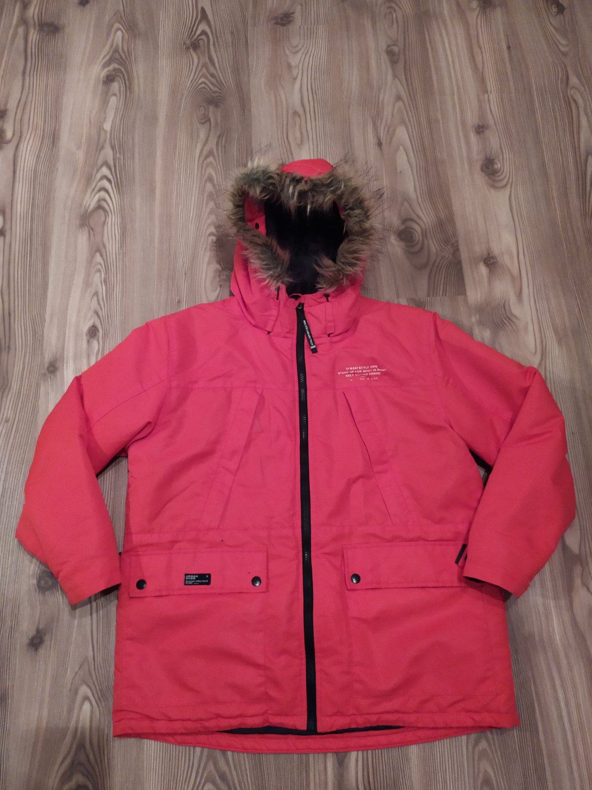 Nosená, veľmi dobrý stav, bez chyby. Kúpila som synovi,ale je mu veľká. Dĺžka meraná stredom chrbta 71 cm, vpredu kúsok kratšia. Šírka 58 cm, rukáv od krku 70 cm. Je zimná, ale nie veľmi hrubá. Farba pekná, výrazná, červeno-oranžová