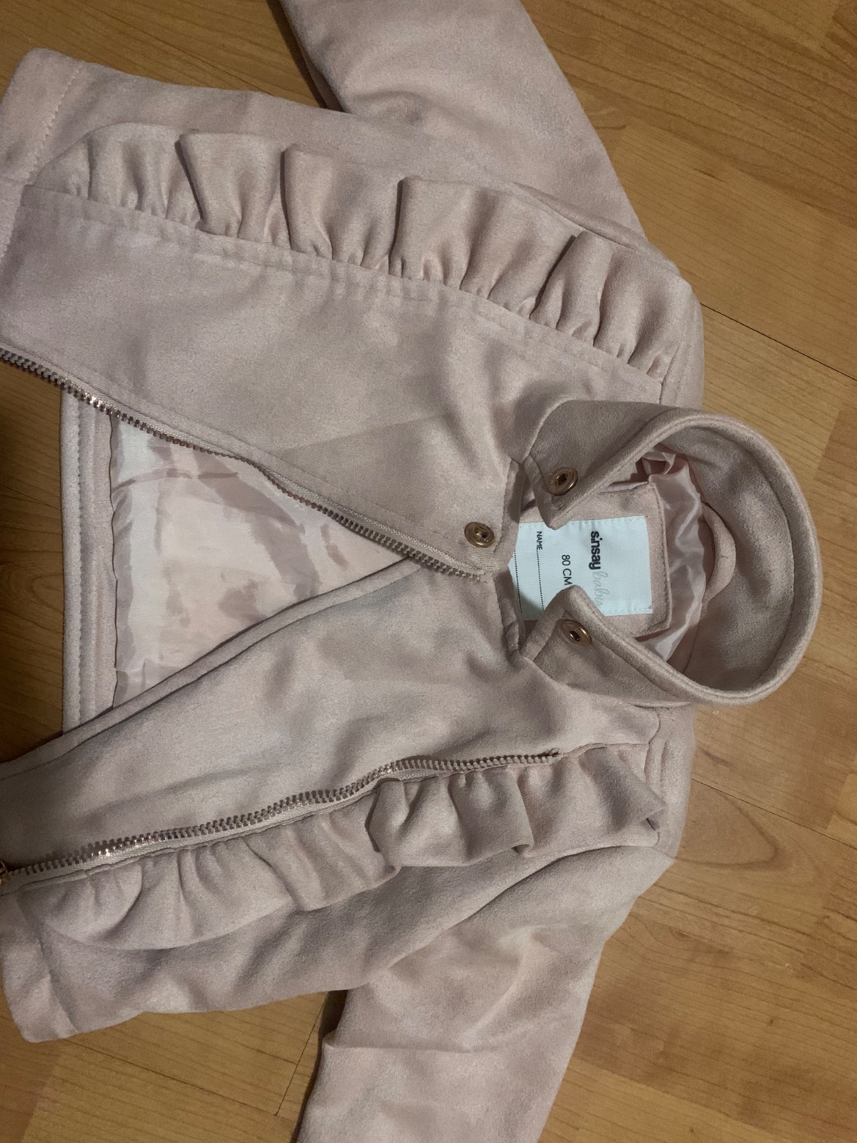 Vatovaná (hrubá) prechodná bunda pre dievčatko, veľkosť 80. Nosená, ale bez poškodení, dier/žmolkov/fľakov. Farba staroružová, potlač zlaté srdiečka. Cena 3 € + pošta. Pozri aj ďalšie moje inzeráty...